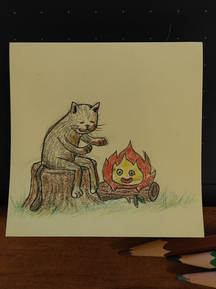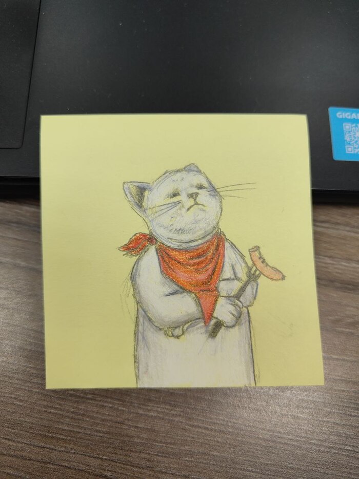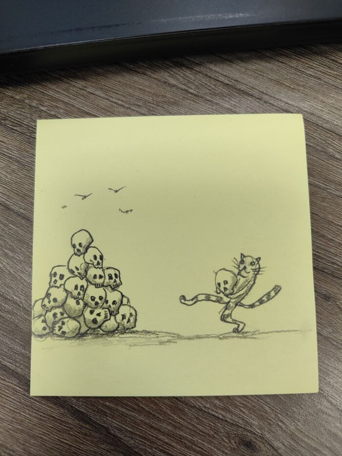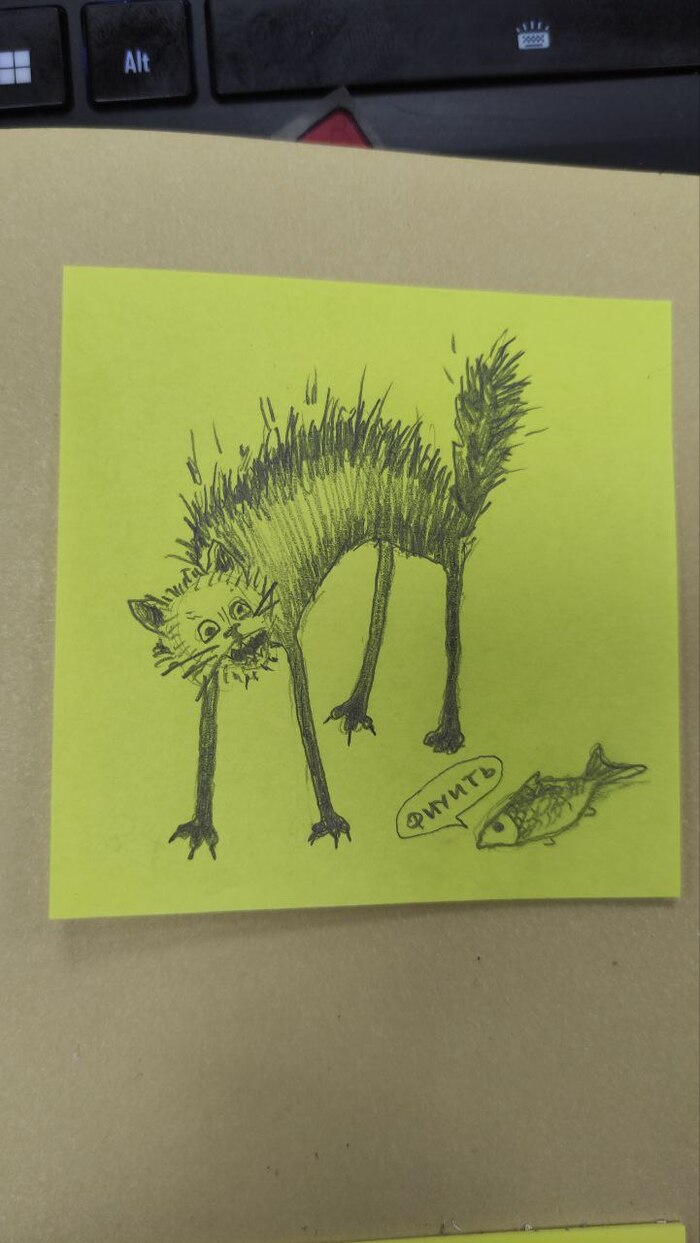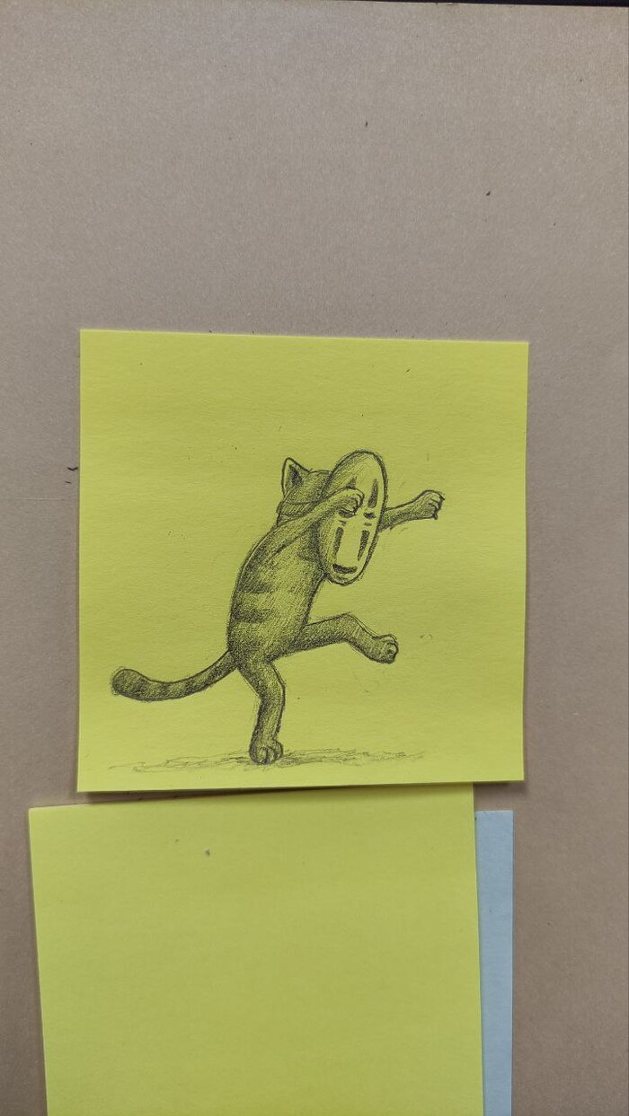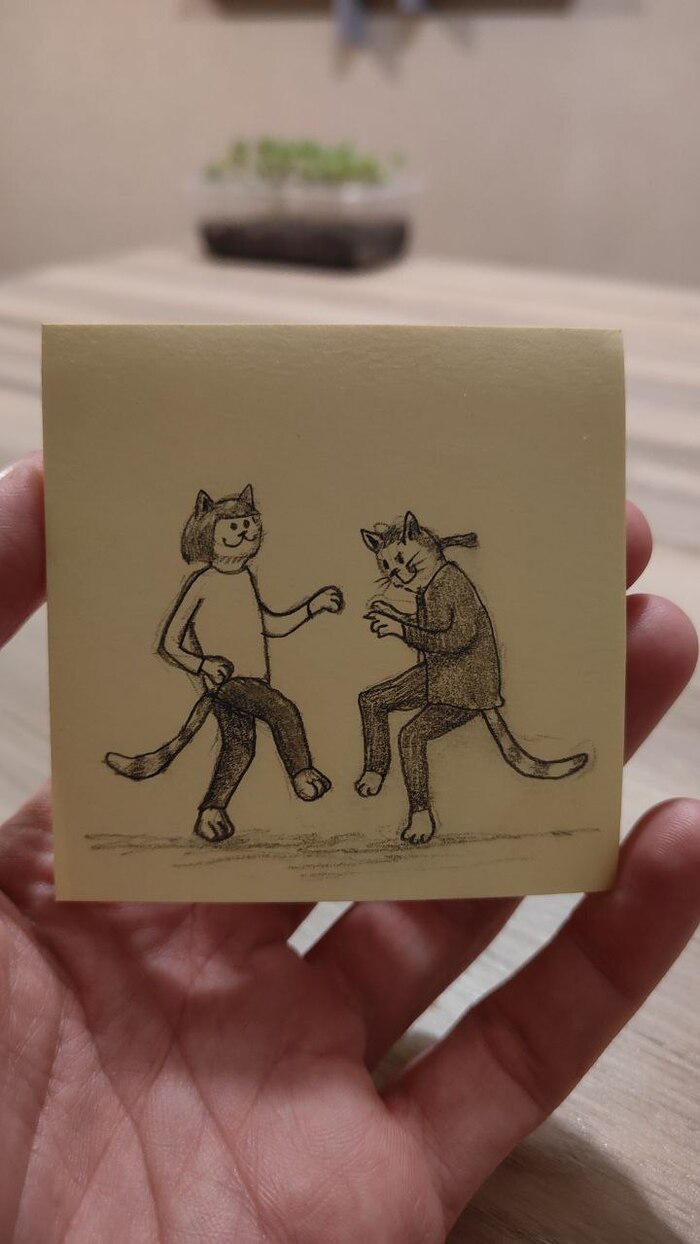 Всем привет! Когда-то нарисовал простой стикер с зайками и подарил подруге на работе. Потом ещё один..и ещё. Сейчас их уже 111 штук и висят они у неё в кабинете на стене. Рисую каждую неделю по одной штуке. Теперь на стикерах почти всегда коты. Это стало приятной традицией.