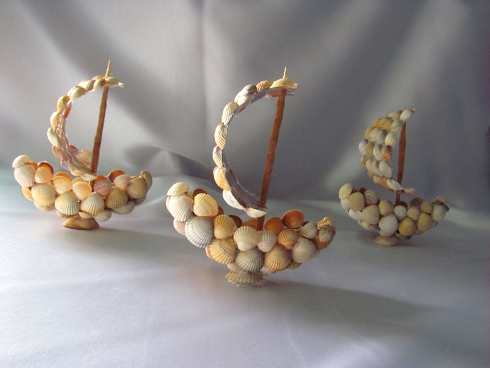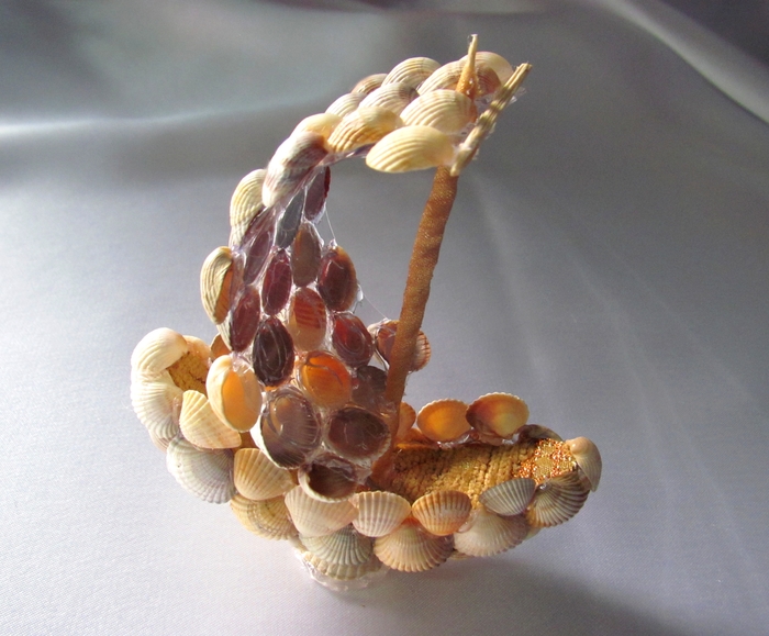 В качестве основы - верхняя часть заколки для волос, мачта - зубочистка, палуба - из плотной обивочной ткани, основа паруса - цилиндрическая упаковка от детских резиночек.