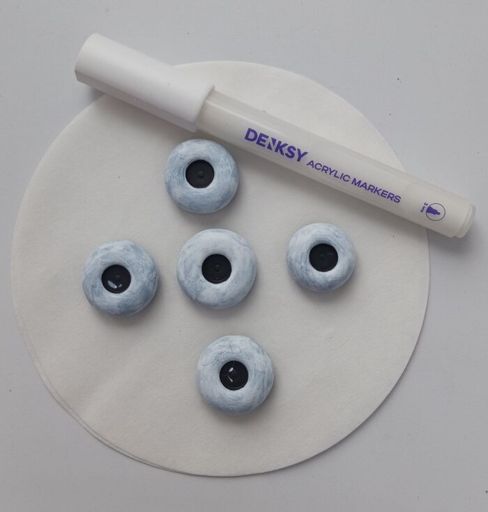 Глаза леплю из полимерки, почему-то больше нравится из чёрной, потом крашу акриловым маркером в два слоя (в маркере краска укрывистей и даёт очень тонкий слой) и сверху акриловой краской, потом рисую капиллярчики, тонирую, клею радужки да лаком покрываю.