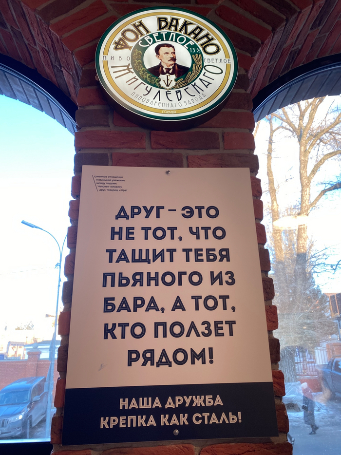 Думаю, автор не имел ввиду бар. Но в комментах многие про него написали. Был в командировке неделю в Самаре. И, да, каждый день заходил. Не столько пить, сколько смотреть на эту атмосферу. Разные люди, разные взгляды, и ни одного конфликта!!! И это в пивном баре вечером , забитым полностью!!!!!