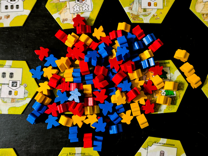 Стоит отметить, что картон очень плотный, приятный на ощупь. Миплы тоже вырезаны на совесть. Однако ресурсы в виде разноцветных цилиндров не впечатляют – можно было бы сделать хоть что-то похожее на дерево, металл, камень и золото.