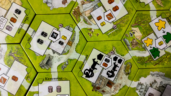 Покупая гекс, вы его присоединяете к своей деревне. Так же, как и «Каркассоне» – река к реке, поле к полю, а дорога к дороге. И вот отсюда и идет ассоциация с легендарной игрой. Берешь тайл, присоединяешь к другим постройкам и получаешь профит. Вот только вместо того, чтобы случайно вытягивать тайлы, вы боретесь за них в аукционе, и получаете не просто победные очки, а инструменты для их получения.