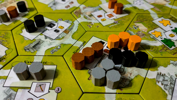 Да, при действии производства можно выставлять рабочих в свою или чужую деревню. Часто бывает, что нужное вам производство выкупил другой игрок. Так что, чтобы у вас был, например, камень – вам придется пожертвовать своих рабочих врагу. А также на здания, которые сейчас на торгах. До окончания торгов они нейтральные, но после аукциона тот, кто выкупил гекс, то есть выставил на торги больше всех своих рабочих, – становится его хозяином. Хозяин территории заберет в конце раунда всех рабочих со всех своих гексов. А я напомню, что рабочие – это главная валюта в игре.
