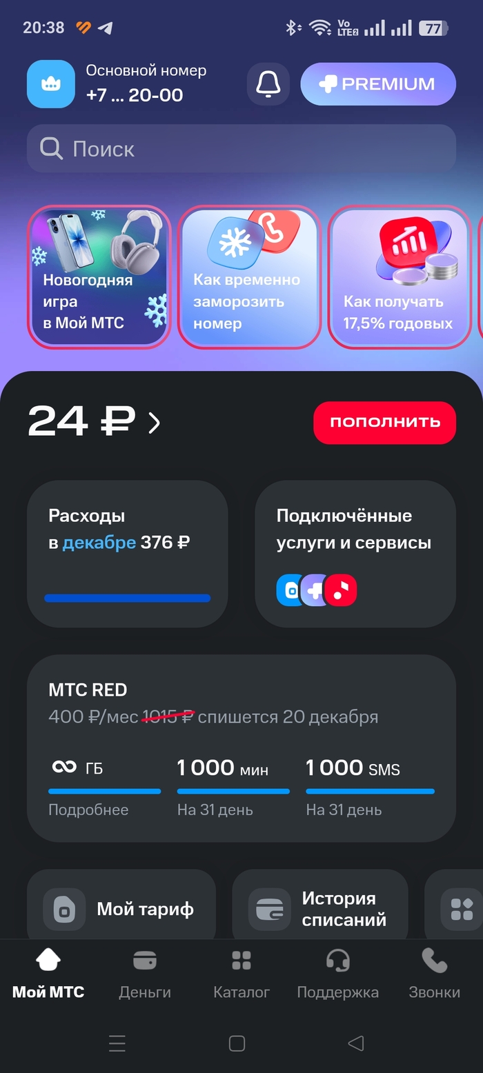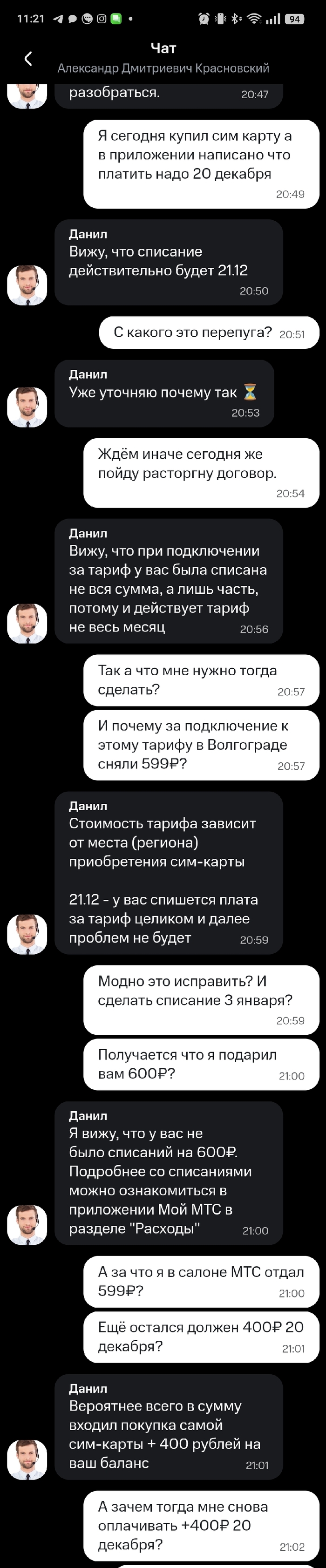 По итогу дома, установив личный кабинет МТС. Зайдя в него по новому номеру с тарифом RED за 400₽, и вот я узнаю, что я просто подарил 49₽ в офисе раз. Списали не всю абонентскую оплату, а только часть её два. Оставив мне 24₽, мол мы дарим вам 24₽. Мы же щедрые ребята. Ну и вишенка на торте ТАДА ДА ДАМ, Я ещё остался должен им 376₽ сраных рублей иначе они аннулируют доступ к сотовой связи и я должен буду им оплатить штрафы за не своевременную оплату по тарифу. То есть в декабре за RED я получается должен оплатить 1000₽ в сумме кайф. 599₽ отданные в салоне, за 17 дней, которых им показалось мало как-то , я же алигатор🤣🤣🤣. Хотя я уточнил у менеджера девушки, что списание точно будет 3 числа она ответила да точно, платить больше не придется, нет конечно же. По итогу нихрена не точно. И плати полную стоимость в декабре. Сукаааа вот зачем берут молодых ТУПОРЫЛЫХ НА РАБОТУ, чтоб потом им портили нервы, орали на них?