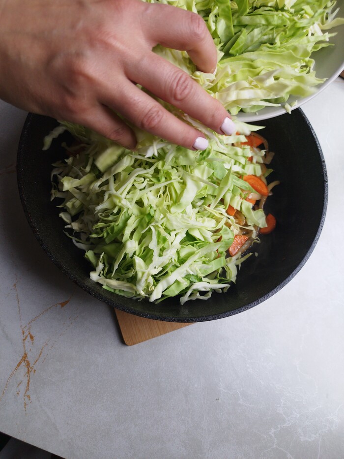 8. Добавляем масло, разогреваем его и выкладываем на сковороду половину капустно-яично-морковно-луковой смеси. Даём чуть-чуть схватиться.