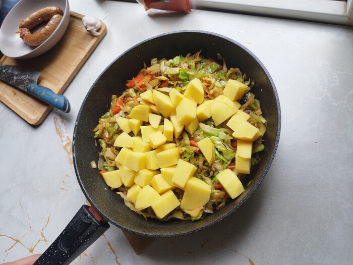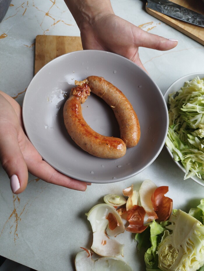 1. Тонко нашинкуем капусту и морковь (её можно натереть на тёрке для моркови по-корейски). Некрупно порежем лук.