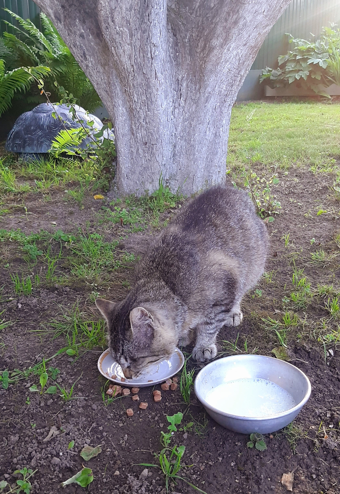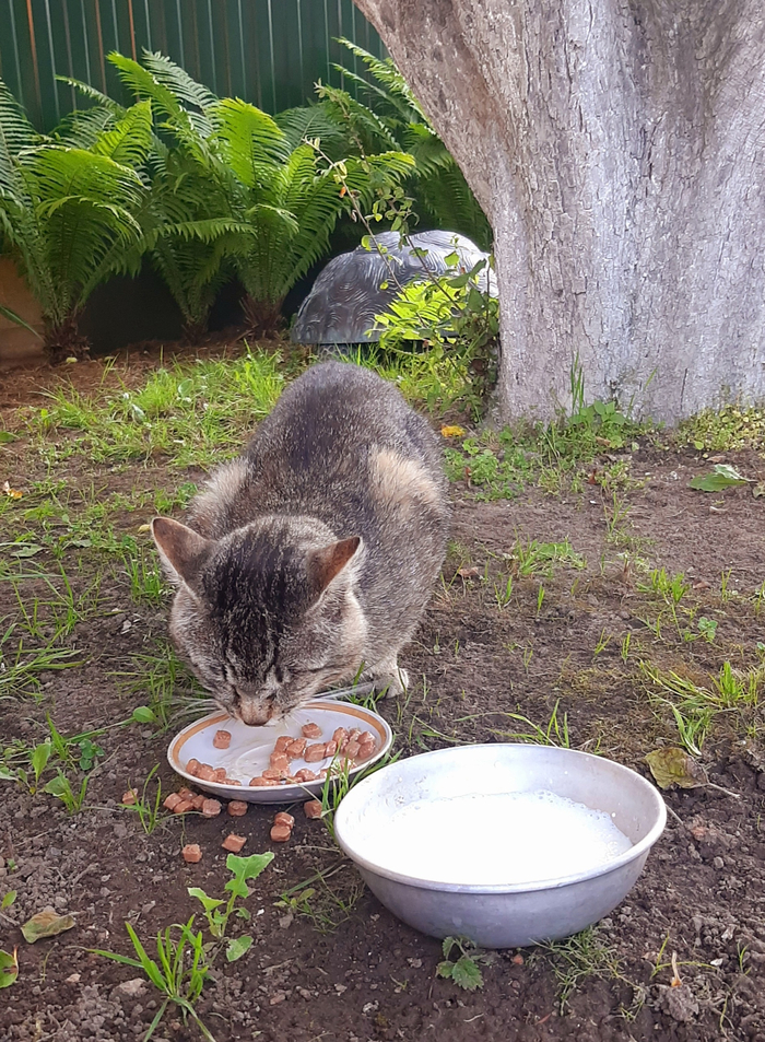 А вот мне надо бы поменьше его кормить. Вот что! А то вон какие бока отъел! Когда он всё съел и пошёл прочь виляющей походкой, я на секунду подумал, что ОН - это ОНА, причём беременная. Но увесистый боекомплект под победно вздёрнутым хвостом развеяли все мои сомнения. Это КОТ! Просто жирненький.