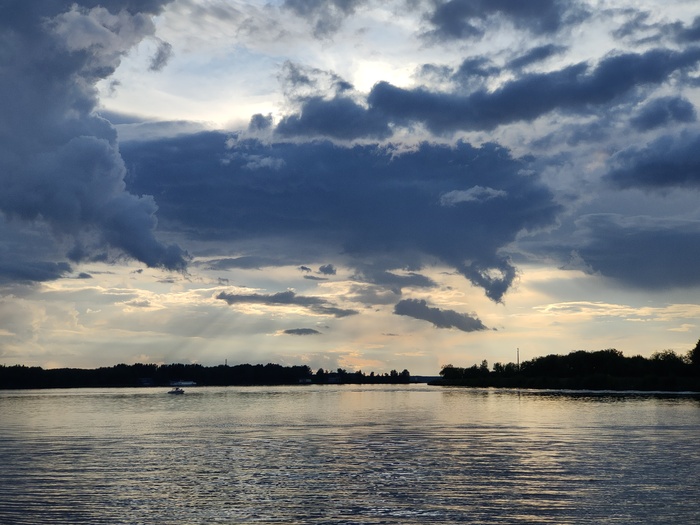 Возвращаясь к каяку, заметил интересную картину: над водохранилищем висели тяжёлые тучи, грозящие дождём, волны бились о берег.