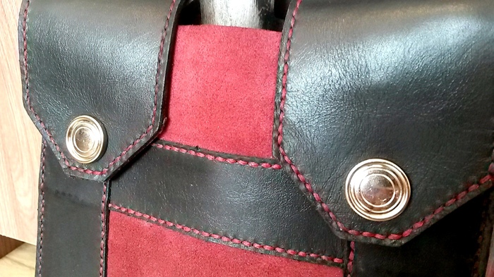 Черная кожа КРС 1 мм, бордовый спилок 1,2 мм, пробойник косой 4 мм, нить бордовая вощеная 0,8 мм, кнопки типа "альфа".