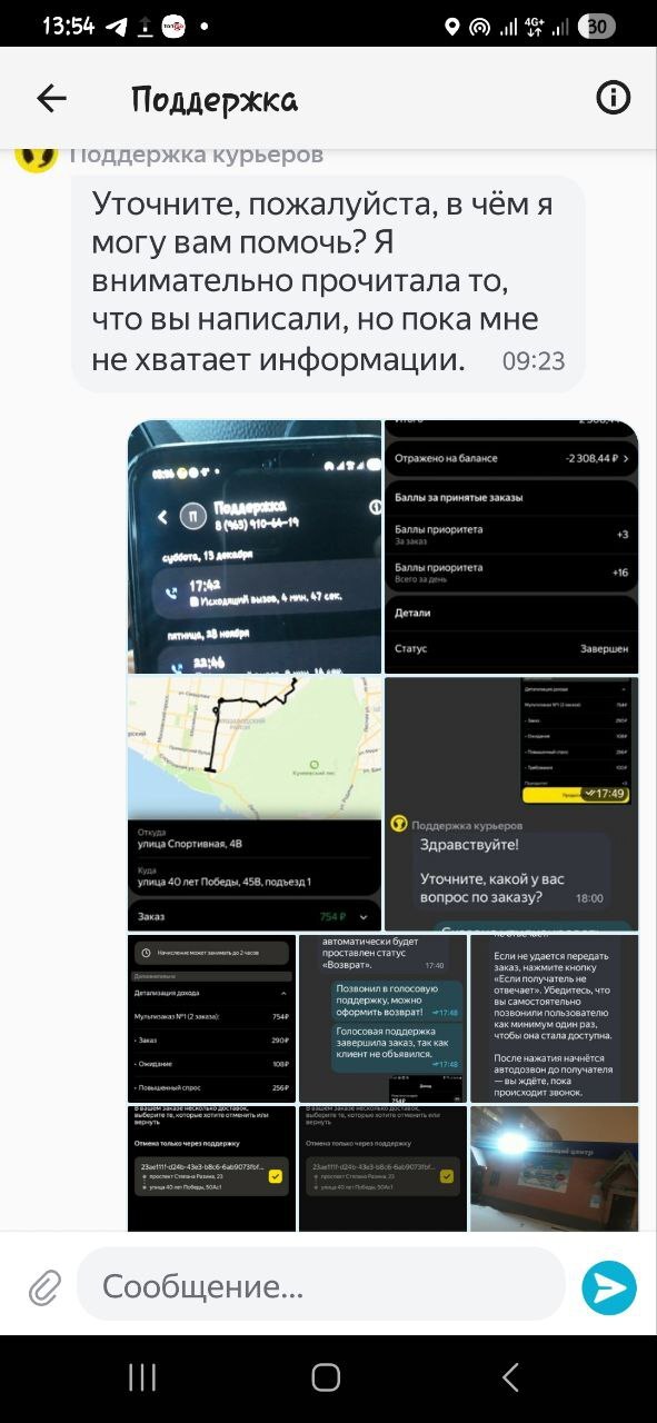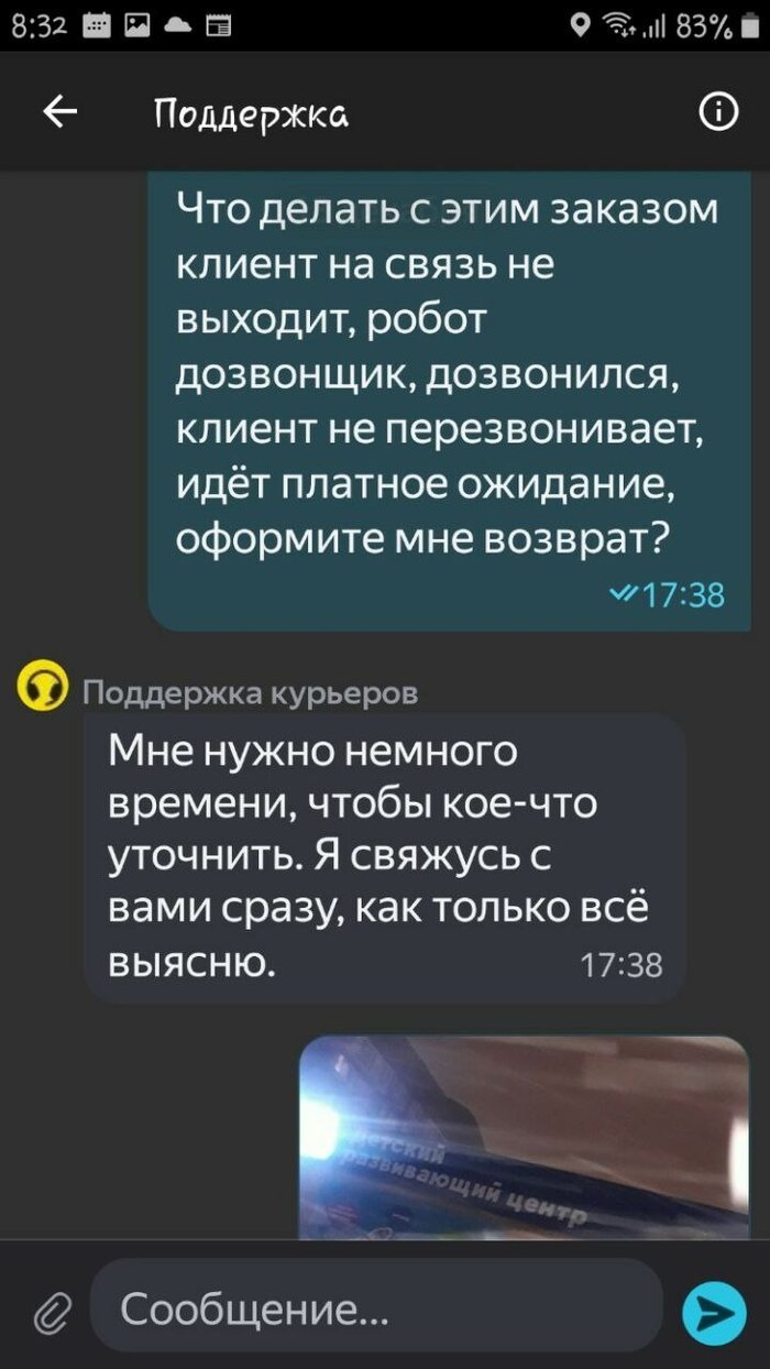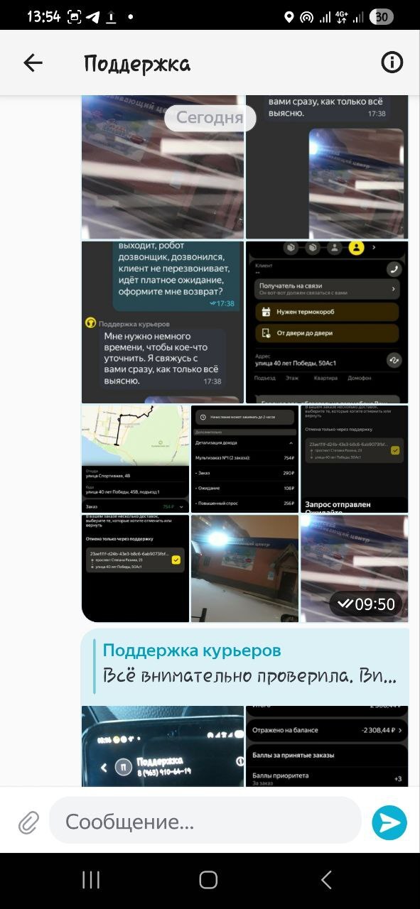 Здравствуйте, рассказываю очередную ситуацию с Яндекс Доставкой (Яндекс Про) и его произволом...ЧТО ХОЧУ ТО И ВОРОЧУ!!! 13.12.2025 года мне поступил мультизаказ 724761. В этом заказе было 3 заказа из Ростикс и видимо из Яндекс Еды. Один заказ необходимо было доставить на ул. 40 лет Победы 50с1, там находится детский садик "Я уже большой". В заказе какие либо комментарии отсутствовали. Я приехал подошёл к двери и она оказалась закрыта и в здании свет вообще не горел нигде! Я попытался дозвониться до клиента, но звонок не проходил, просто тишина. Запустил "Автодозвонщик"... и система сообщила мне, что клиент свяжется со мной. Но к сожалению клиент на связь так ни вышел. Я на точке провел около 20 минут, писал в поддержку, но ответа не получал. Далее попытался оформить через кнопку "отмена или возврат" возврат. Но система писала о том, что со мной свяжется служба поддержки и через приложение я это сделать не смог. Со мной никто не связывался, тогда я позвонил в поддержку голосовую +79639106419 за разъяснениями. Сотрудник службы поддержки все проверил и принял решение об отмене заказа с утилизацией заказа. А письменная поддержка так и не ответила вообще на мои запросы, как ни странно, а может специально! Я сотруднику поддержки задавал нескольок раз вопросы о необходимости возврата на точку А заказа, на что получал ответ о том, что это не требуется и его нужно утилизировать. Далее заказ был мне зарыт и оплачен.