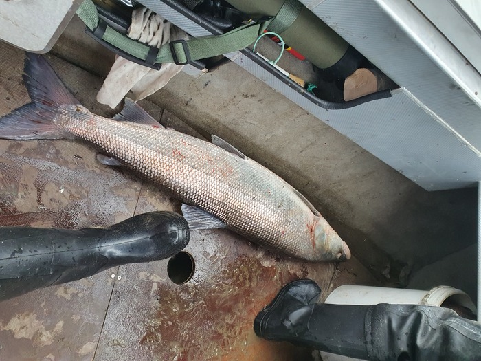 Пришел капитан и позвал нас сфотографироваться с крупными щукой и нельмой. Они ещё утром успели проверить свои сетки и обнаружили так пару крупных особей.