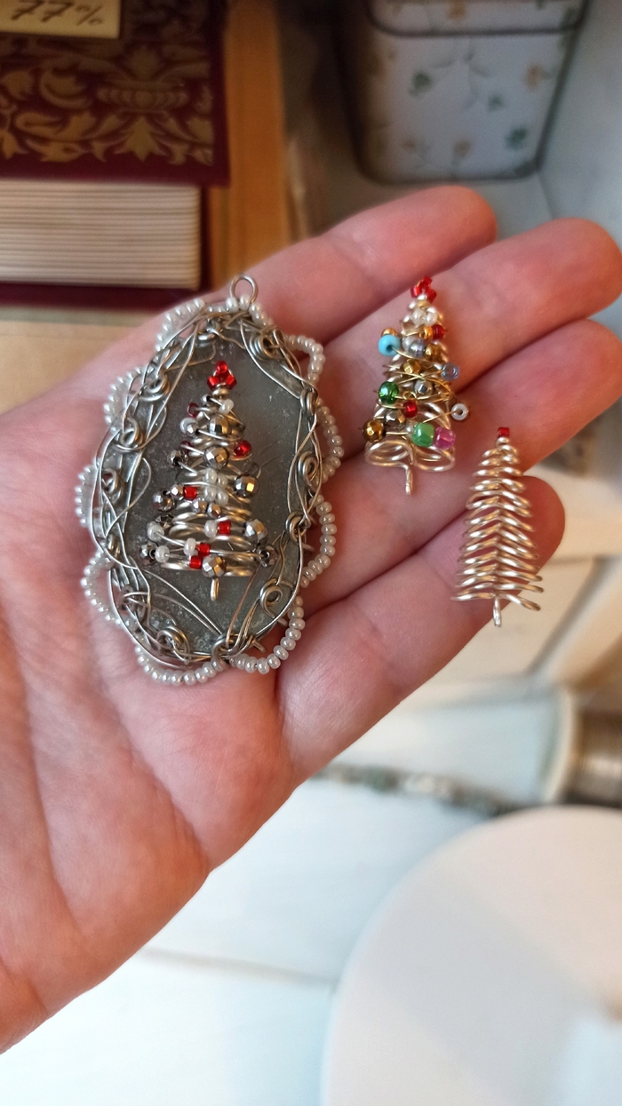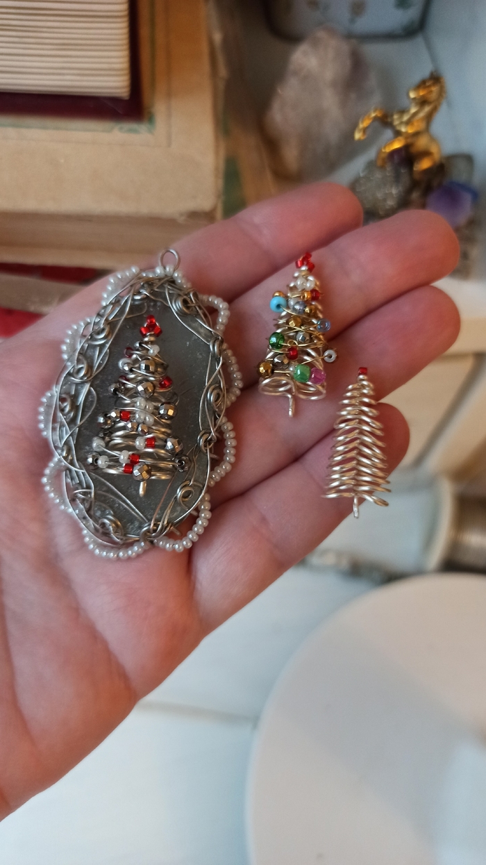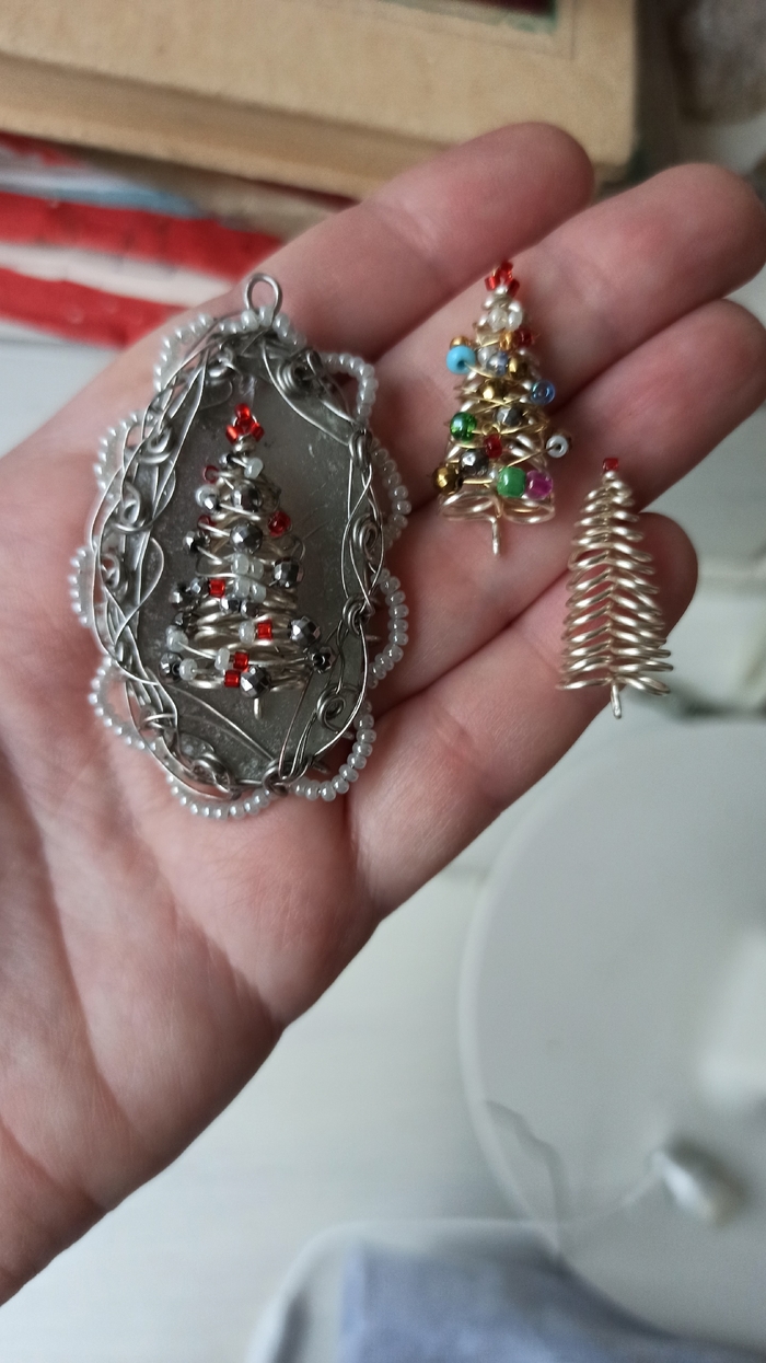 Вторая ëлочка - стильная. В одном колоре: серебристый, красный и белый. Современная такая ëлочка.А третья ëлочка-красавица в нарочито минималистичном стиле: всего лишь проволочные завитки и красный огонëчек сверху...