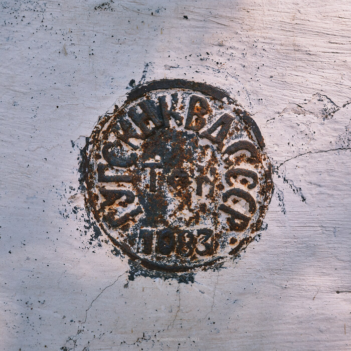 В центре марки отверстие под отверстием цифры, можно подумать, что порядковый номер, но нет, все интереснее. Числу соответствуют сведения в реестре о высоте над уровнем эталонного кронштадского футштока. Это один из старейших действующих метрических футштоков (реечный уровнемер) соответственно высота отградуирована в сантиметрах.