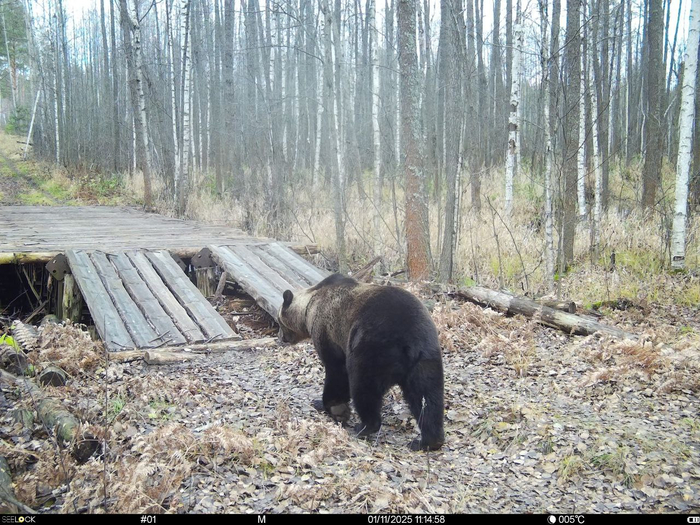Берлога – это, конечно, не землянка с кроватью и печкой, которую рисуют в детских книжках и мультфильмах. Медведь просто выбирает завал или яму, на которую упало несколько деревьев, и ложится туда спать, а сверху его засыпает снегом. Наблюдение с помощью фотоловушки за использованной берлогой полузакрытого типа показало, что в течение года медведь ни разу к ней не подошёл.