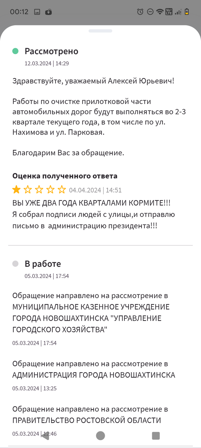 Администрация города в сервисе Решаем вместе постоянно пишет отписки одному и тому же человеку о том, что все уберут и по итогу уже два года никто не может убрать эту часть дороги.