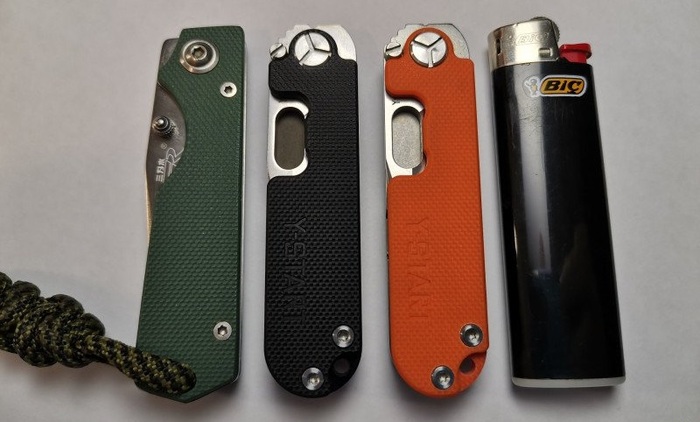 Мой первый нож с лезвием типа "танто". Сложенный он размером с маленькую зажигалку Bic. Прочно засел в маленьком кармашке моей сумки и постоянно выручал меня со вскрытием посылок, упаковок, подрезанием ниток, зачисткой проводов и прочим. Продукты, конечно, нарезать сложно, но при желании можно, на работе даже торт нарезать умудрились этим малышом за отсутствием наличия другого ножа.