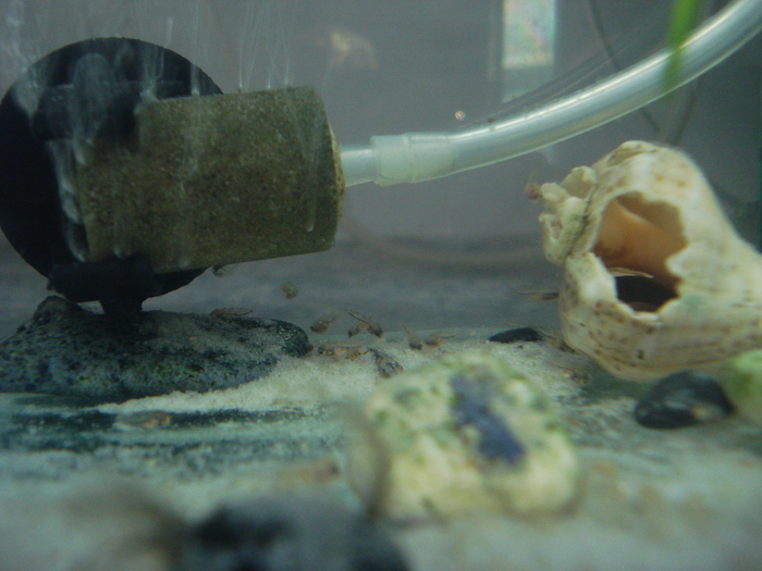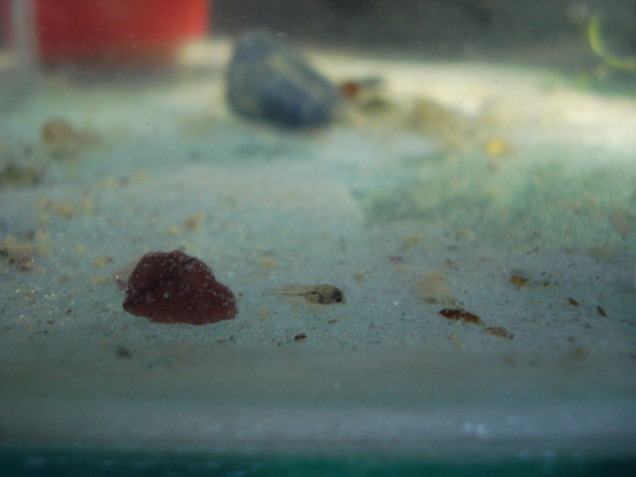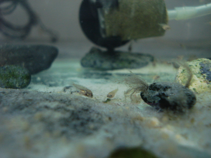 Рыбок-родителей продали, цинично посчитав, что 150 гривен -- это лучше, чем молодняк. Я прихожу после смены хозяйки-крысы, и вижу пустой отсек, благо, гнездо и икра были целы. Пару дней икра висела сама, я перекинул туда аэратор под самую кладку, проточный шланг из-под фильтра шел тоже рядом. Увы, десяток-другой икринок все же побелел и пропал.