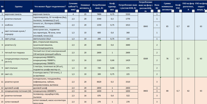 По дому: 105м, кухня-гостиная, 3 спальни, 2 СУ, наружные светильники; отопление газовое (теплый пол + радиаторы), эл.теплый пол бросил только на террасу в стяжку (которую когда-нибудь планирую застеклить). По сути все потребители попытался описать в таблице, разбросал по группам, группы - по фазам, чтоб более или менее равномерно было.