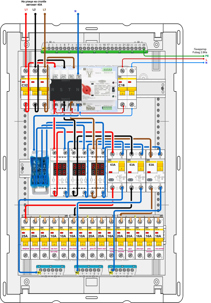 Также поясню: щит со счетчиком и автоматом на 63А висит на столбе у дома, далее на столбе вводной на 40А (сейчас в доме по-дурацки стоит на 50А; в принципе можно на столб переместить этот на 50А, а в дом - на 40А; сейчас в щит нарисовал 32А - ХЗ, как лучше). На схеме на 2,5мм2 стоят автоматы и 16А, и 20А - дело в том, что 20А хочу оставить "застройские" (вроде, крамольного в этом нет ничего), все новые покупал уже на 16А. На варочную панель по схеме стоит - 25А, т.к. протянут провод 4мм2.