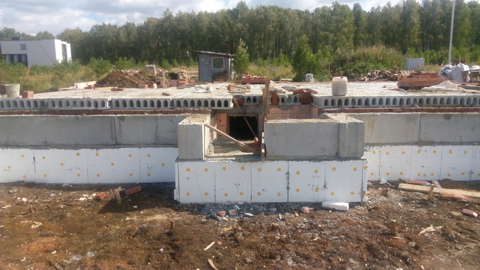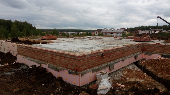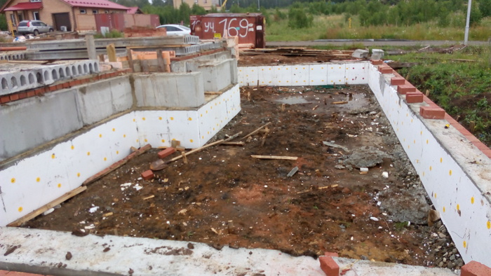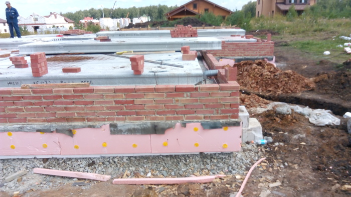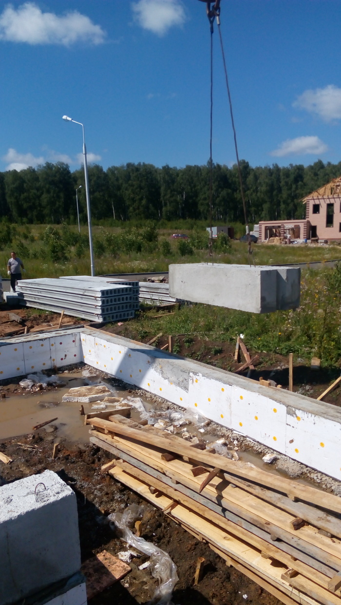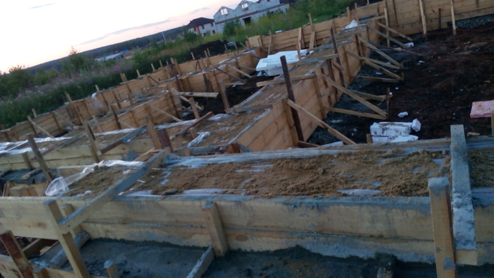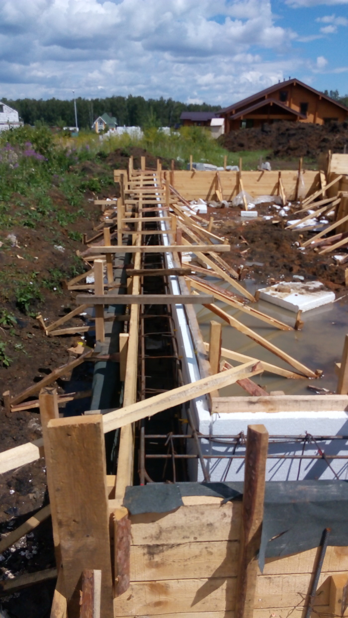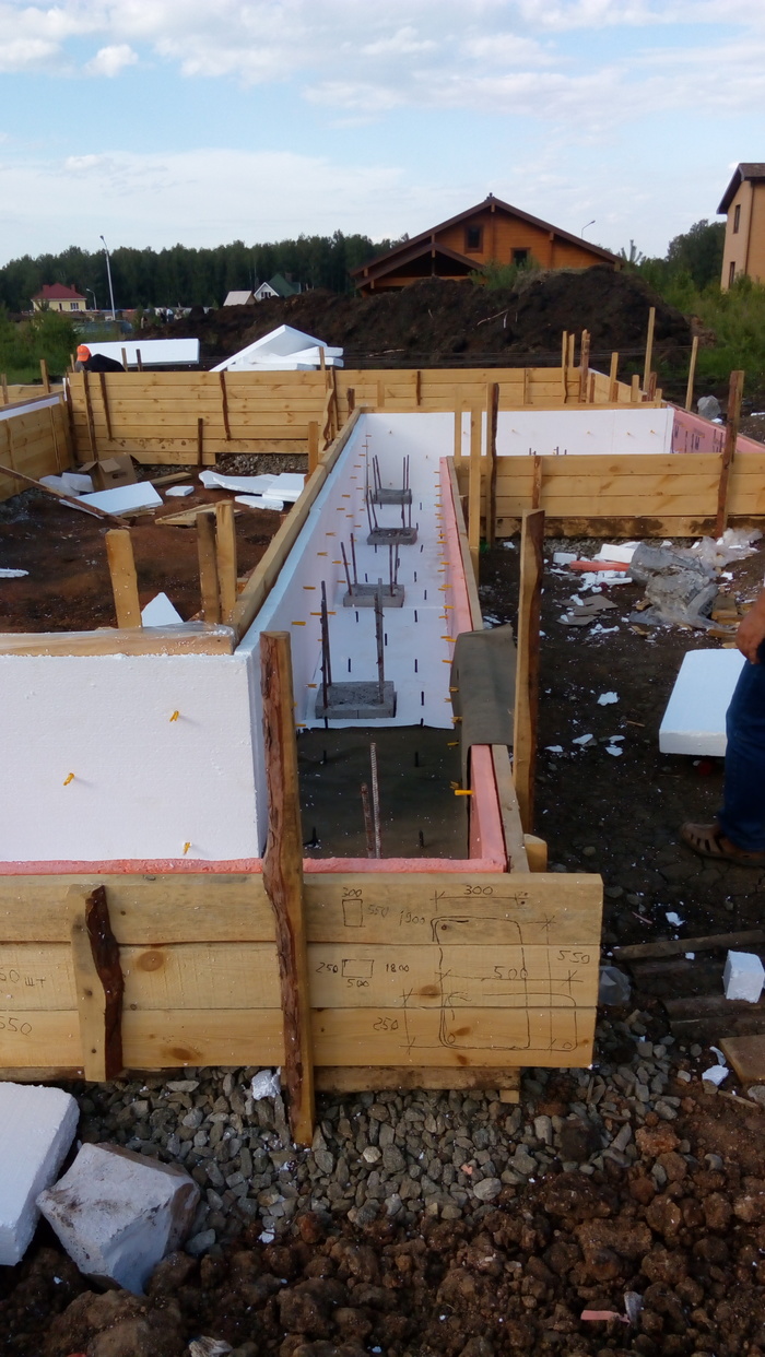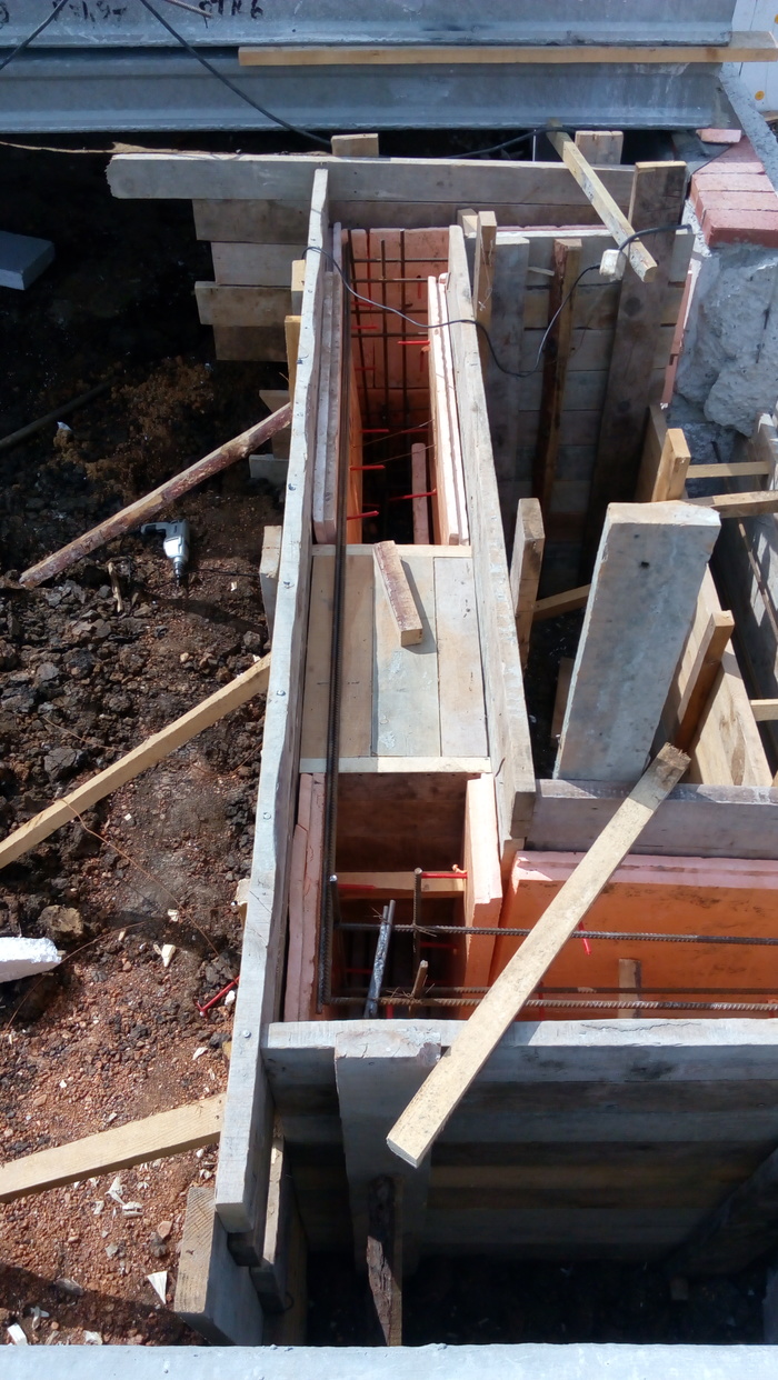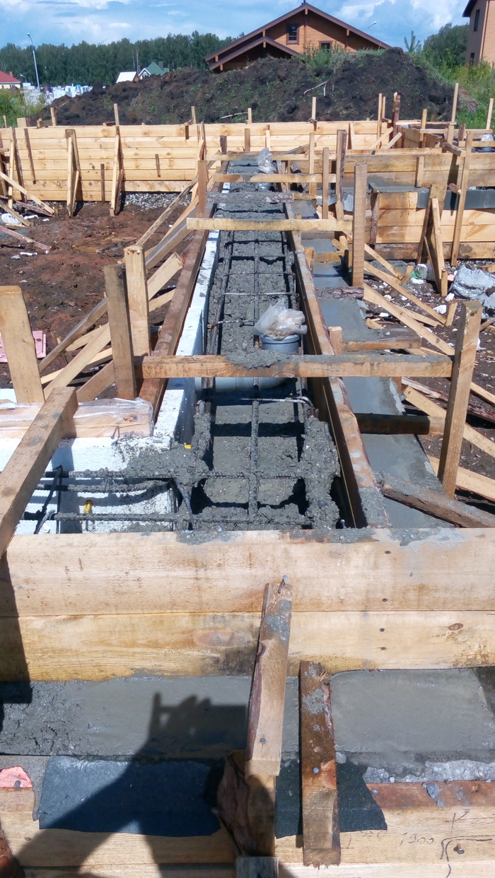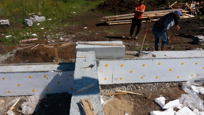 Ростверк практически без опалубки в грунте исполнен. По прикидкам уровня дороги и слухам о ее поднятии поверх ростверка воткнули стеновые блоки 300 мм высотой.