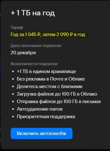 Меня сума заинтересовала, не помню чтобы за 2к подключал, большой объем не особо нужен. На моей памяти подключал 1тб заметно дешевле. Хаха, пока пишу пост, проверил банк. Смотрите что творят, оплата в 2024, и списания в 2025: