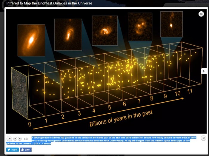 Трехмерная проекция почти 300 галактик в переписи в той же части неба. Третье измерение показывает, сколько миллиардов лет назад мы видим каждую галактику, определяемую наблюдениями обсерватории Кек. Наверху изображены космические телескопы Хаббла из пяти галактик в переписи.
