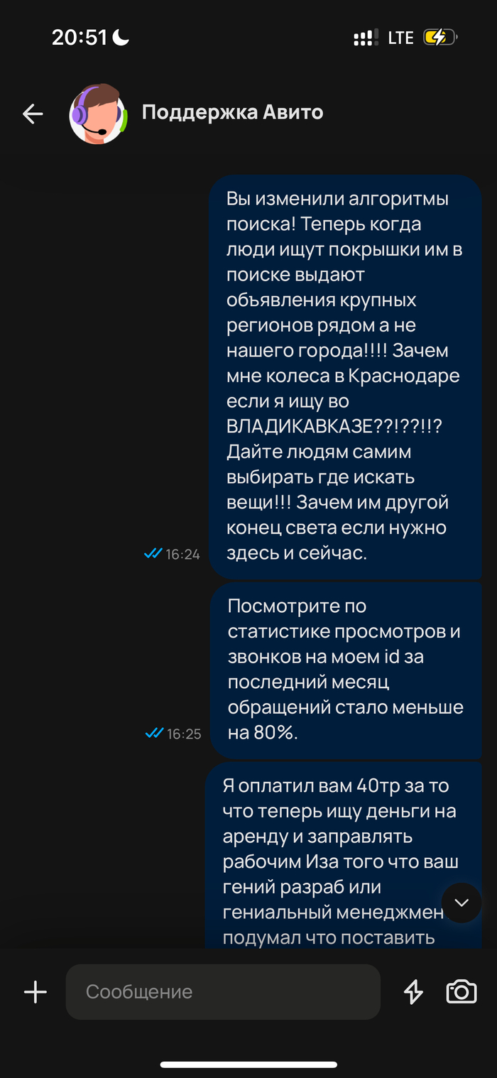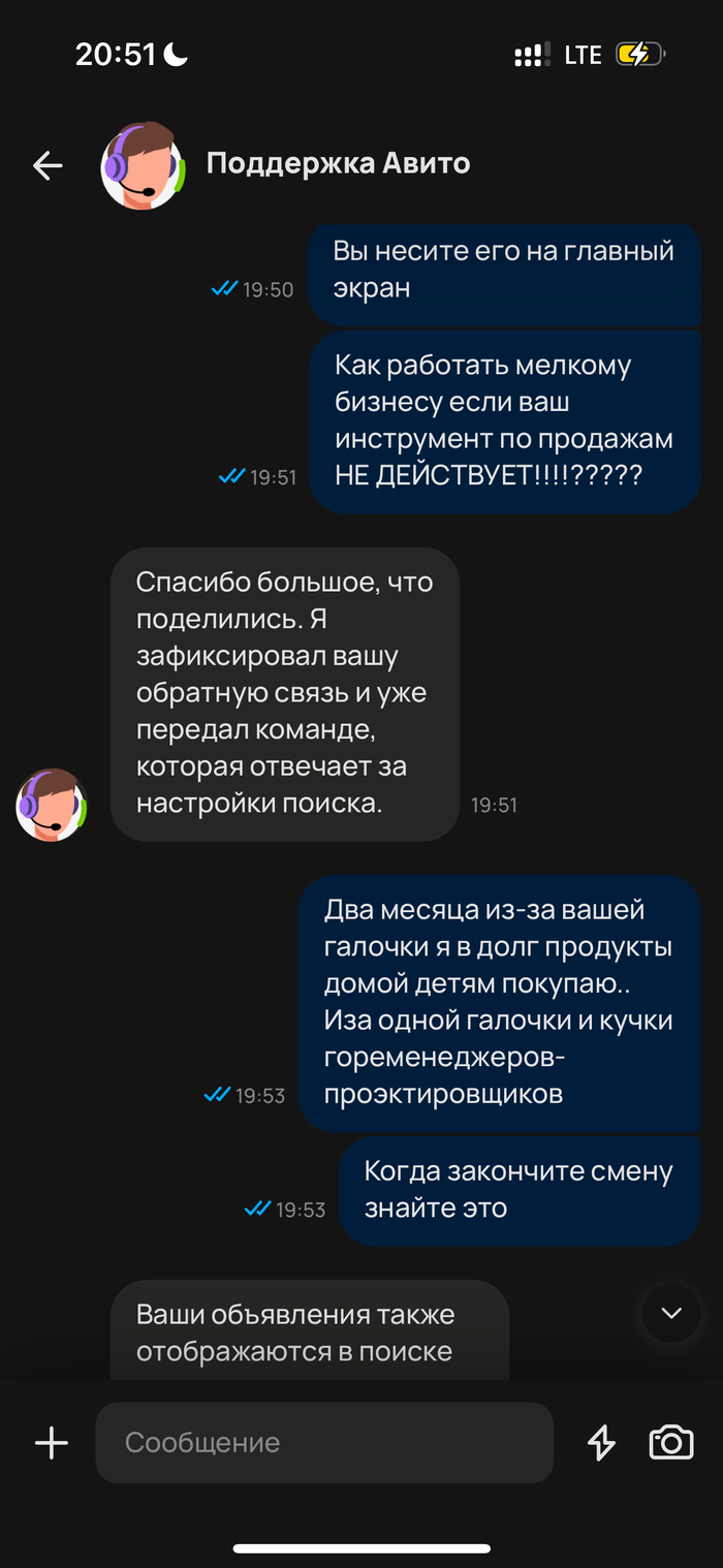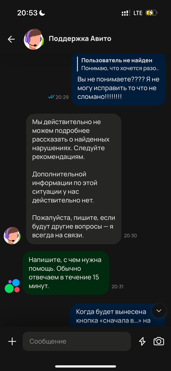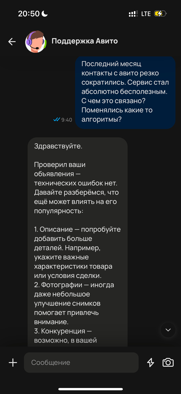 Размещаю объявления на этом плохопахнущем сайте уже 13лет. Руководствуясь фразой «нас совокупляют, а мы крепчаем» стиснув зубы все терпим. Было бесплатно потом 5.000 потом 12.000 сейчас 40.000 в месяц. А что поделать монополия она такая. Второй месяц продажи на нуле.. только «сарафан» и фраза а мне сказали что тут мне помогут.. Звонки с авито утихли, хотя объявления проплачены и висят на сайте. Решил посмотреть в глаза безысходности и написать в поддержку