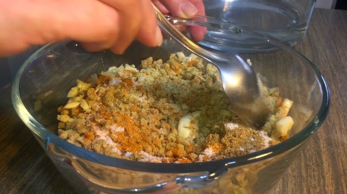 Положим нарезанный чеснок в посуду с орехами и специями и перемешаем ложкой