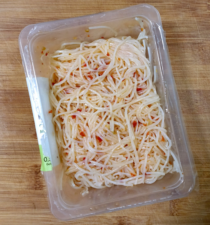 Один из моих любимых салатов — что написано, то и имеем. В составе: крахмальная лапша, сахар, подсолнечное масло, чеснок, паприка, соль, масло кунжутное, уксусная кислота. Дорогое кунжутное масло идёт в списке аж после соли, так что делаем вывод о пропорциях: на ведро подсолнечного — пузырёк кунжутного.