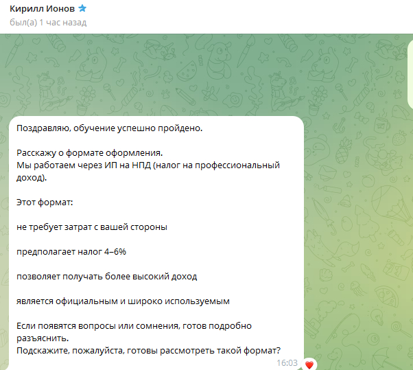 В тг нужно пройти обучение и тестирование. Что подкупает.