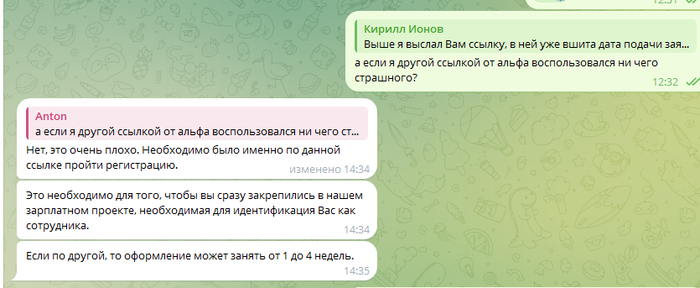 Далее я ему пишу что зарегался по другой ссылке на что получаю, "это очень плохо", что теперь надо будет ждать 1-4 недели