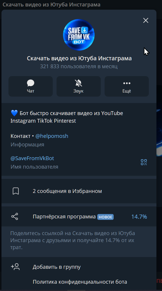 Частенько приходилось подписываться на всякие тг каналы, поскольку без подписки бот не скачивал видео. В основном вполне нормальные каналы. Спустя время просто отписывался(сразу или даже через пару дней нельзя было, бот требовал вновь подписаться).