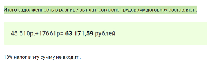 Это не всё, нельзя забывать применить расчёт компенсации за задержку выплат https://calc.consultant.ru/kompensaciya-zarplata на основании статьи 236 ТК РФ. Количество смен в отдельном месяце * 174 р и эту сумму ввести в калькулятор по ссылке.