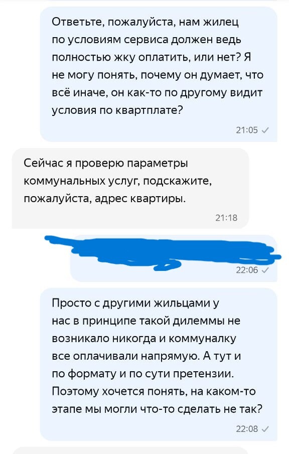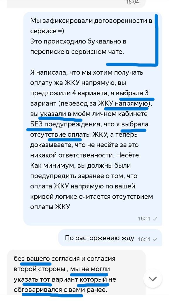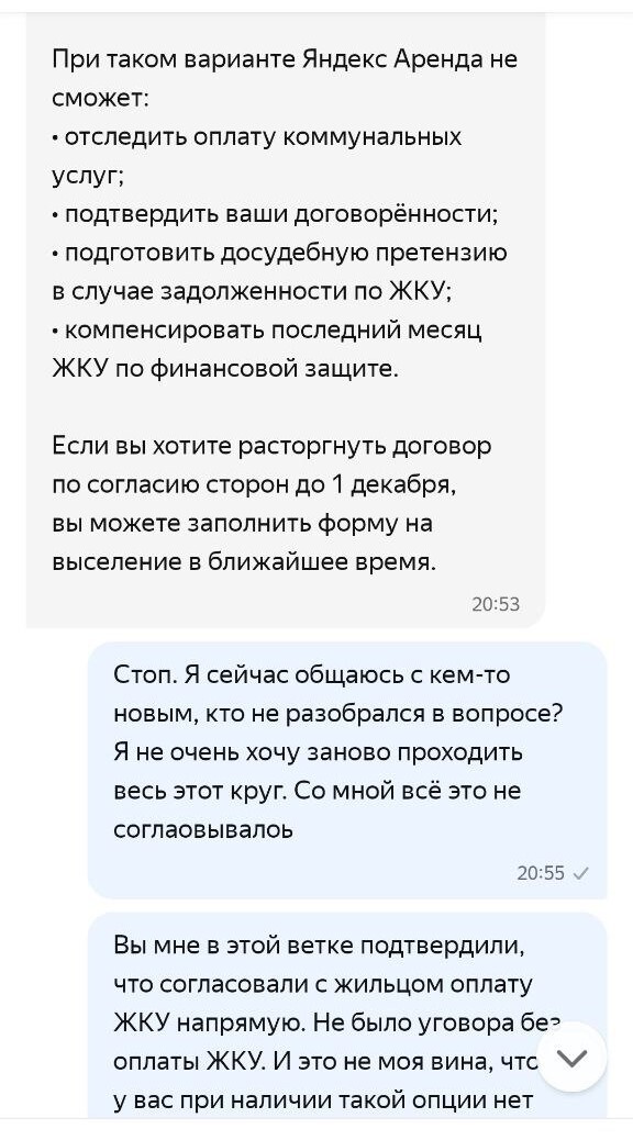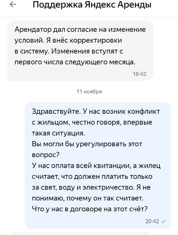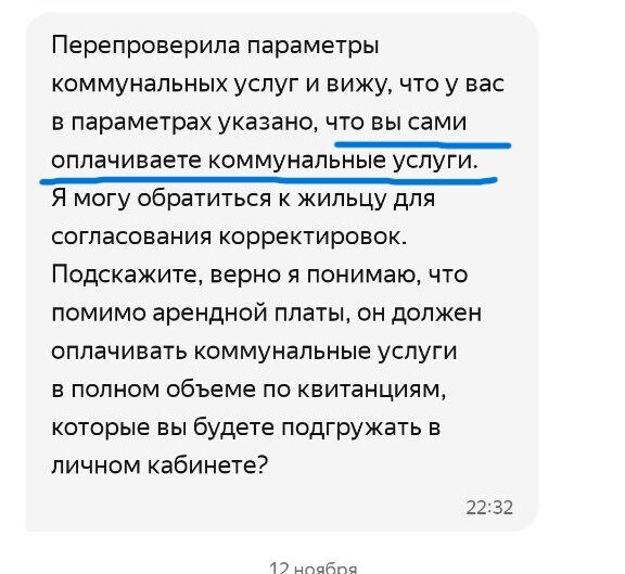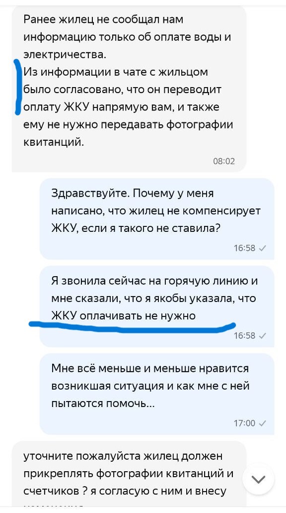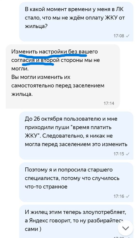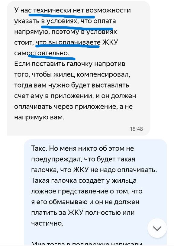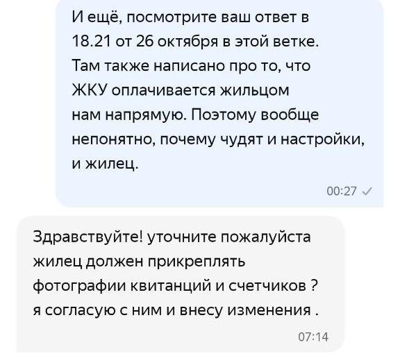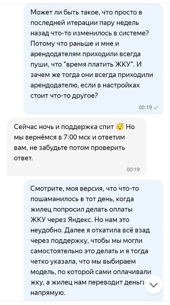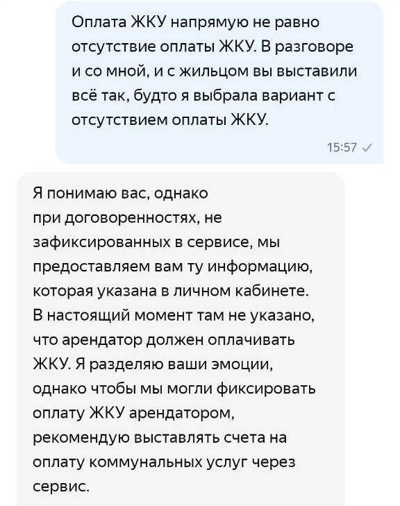 Выясняется ВЕЛИКОЛЕПНОЕ! Если вы хотите и выбираете из доступных вариантов, предложенных системой, чтобы жилец оплачивал вам ЖКУ напрямую и декларируете это в поддержку Яндекс Аренды, а жилец это со своей стороны подтверждает также в системном чате с поддержкой, то они у себя в системе указывают, что ЖКУ не оплачивается. И они могут на голубом глазу написать и жильцу и собственнику, что да, жилец не должен платить за ЖКУ ВООБЩЕ. Что имеет значение в конфликтных ситуациях.