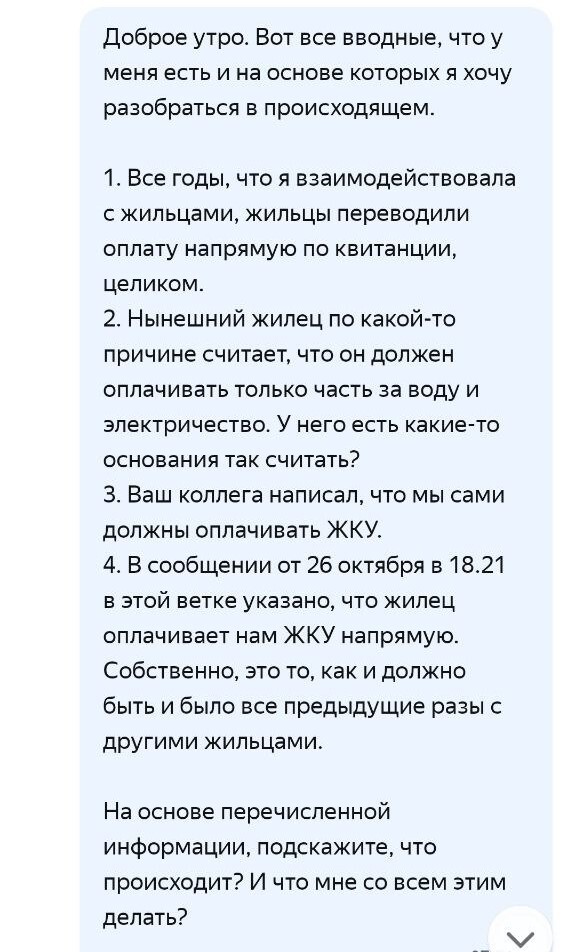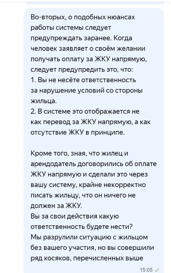 А потом в какой-то момент жилец говорит: и вообще, у меня теперь в сервисе Яндекс Аренды указано, что я ВООБЩЕ НЕ ДОЛЖЕН ОПЛАЧИВАТЬ ЖКУ. И они мне это в чате сейчас подтвердили, лолкек!
