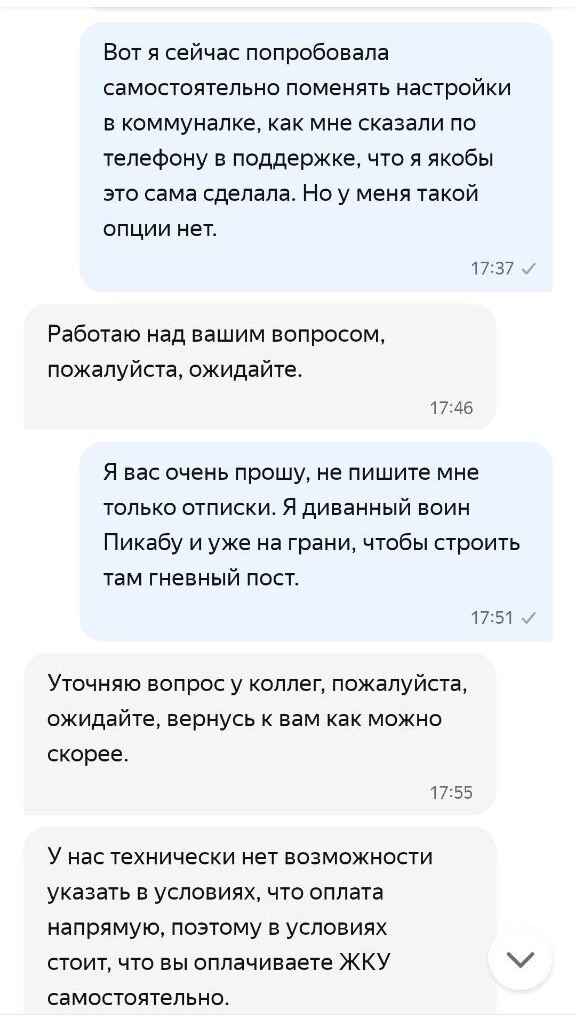 Для таких же зануд как я, вот карусель с переписками, какие-то повторения я оставила, какие-то убрала, но если у кого-то возникнут вопросы, пишите в комментах. Обратите внимание, в одних фрагментах поддержка говорит, что да, они согласовали со мной и с жильцом то, что я просила. В других, что указали, что ЖКУ не надо оплачивать, потому что у них нет технической возможности сделать иначе. В третьих, что я сама в настройках это сделала. В четвёртых, что они не сделали ничего, что не согласовали бы со мной. В общем, веселуха.