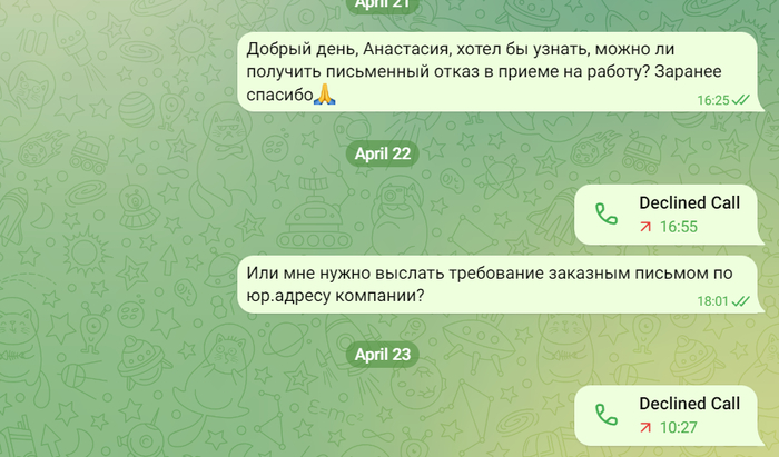 Приближался день выхода на работу, я ждала смс с подробной информацией. За день до этого мне пишет рекрутер: «Добрый день. Вам удобно сейчас будет разговаривать?»