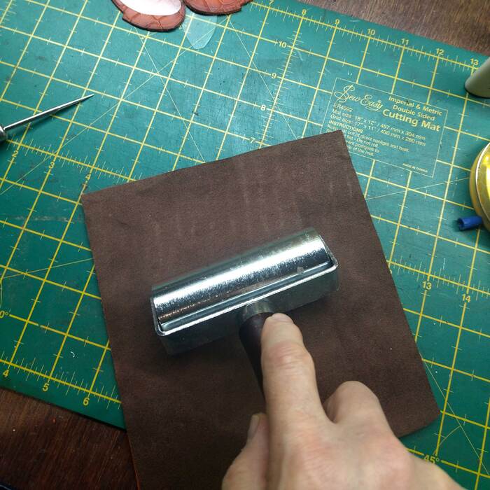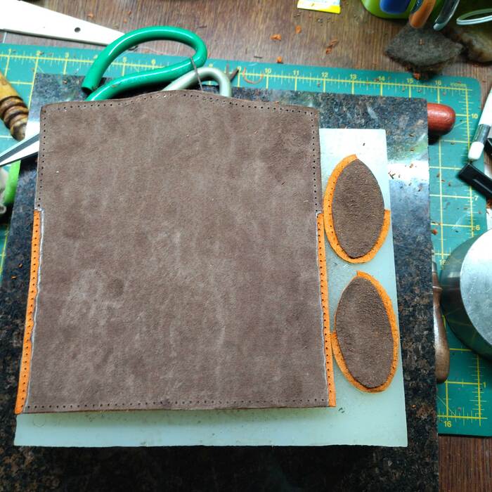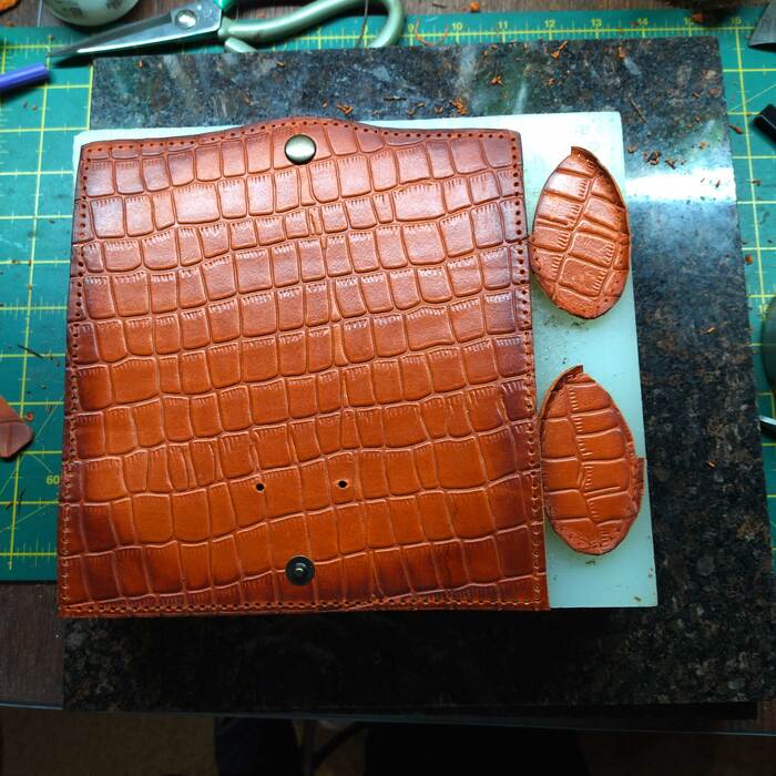 Истончаем край кожи в нужных местах и по выкройке пробиваем кожу под прошивку.