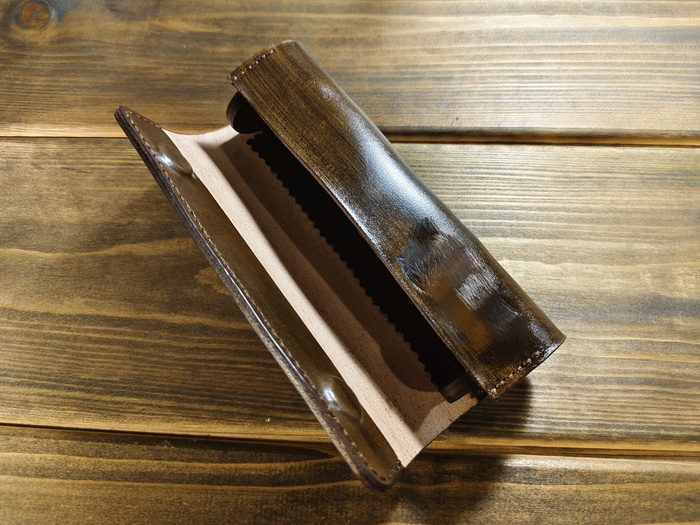 Натуральная кожа. Окраска античным гелем. Вклеена замша внутри футляра.