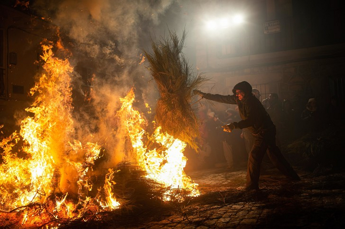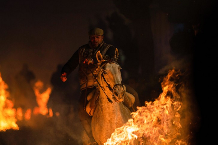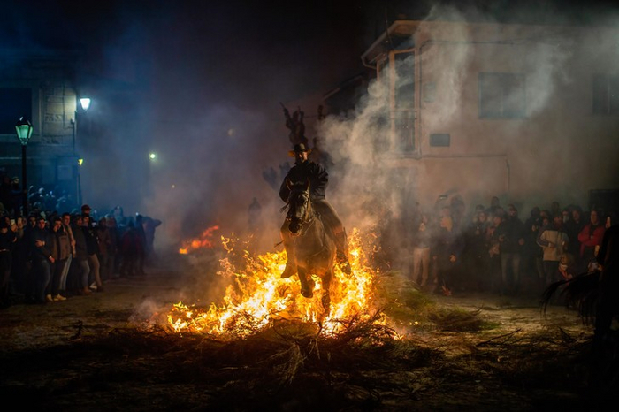 Всадник на лошади перепрыгивает через костёр во время Фестиваля огней в местечке Сан-Бартоломе-де-Пинарес. Ежегодный праздник отмечается 16 января в канун Дня святого Антония Аббата, считающегося покровителем домашних животных.