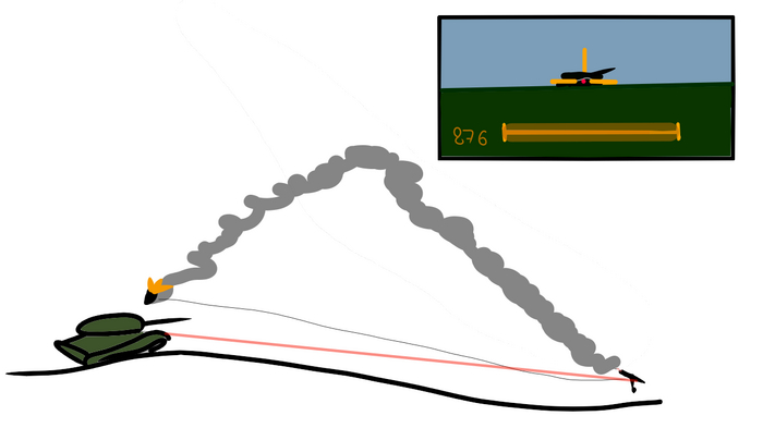 Прикинув по шкале прогресса на визоре прицела, где пространственно находится ПТУР в этот момент, оператор возвращает целеуказатель на цель. Ракета стучится танку в темечко, аки NLAW или Джавелин.