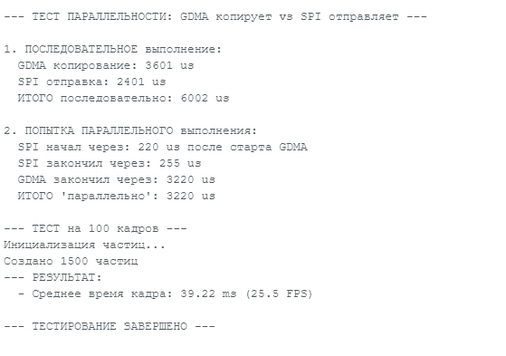 И это дало первые результаты. Сделал класс для перелива данных в фоне и запустил имитацию тяжелых расчетов : последовательное выполнение (перелив + математика + рисовка) дало 15 FPS. А вот параллельное (заливка в фоне + математика + ожидание) — уже 18 FPS на ВСЕХ шести экранах. Уже что-то. Процессор чилил и ждал, пока зальются буферы, а значит, в это время он мог делать что-то полезное.