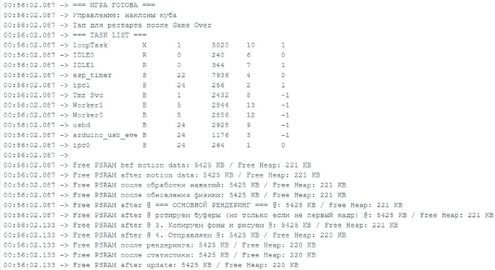 А потом, проверяя, сколько RAM жрет “Змейка”, увидел, что на некоторых этапах съедается почти вся память! Ее всего-то 270 КБ в сумме. Оказалось, PSRAM нельзя напрямую отправлять на экраны, данные все равно сначала копируются в основную RAM память. Пришлось снова переписывать ядро драйвера экранов.