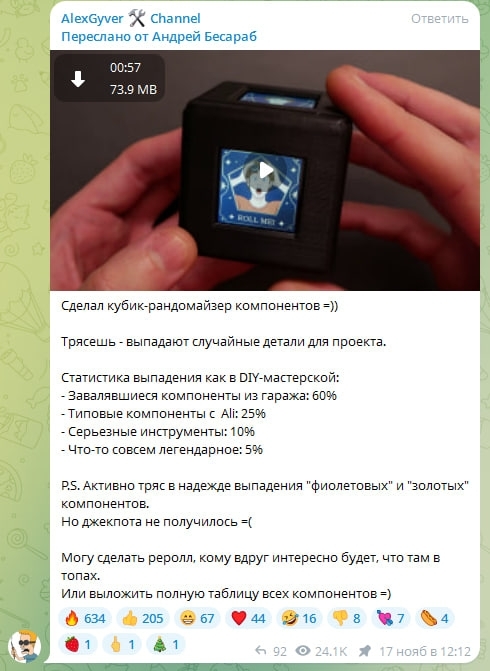 Получить “знак качества”: Репост от AlexGyver — это не просто хайп. Это подтверждение от авторитета в индустрии, что идея интересна целевой аудитории.