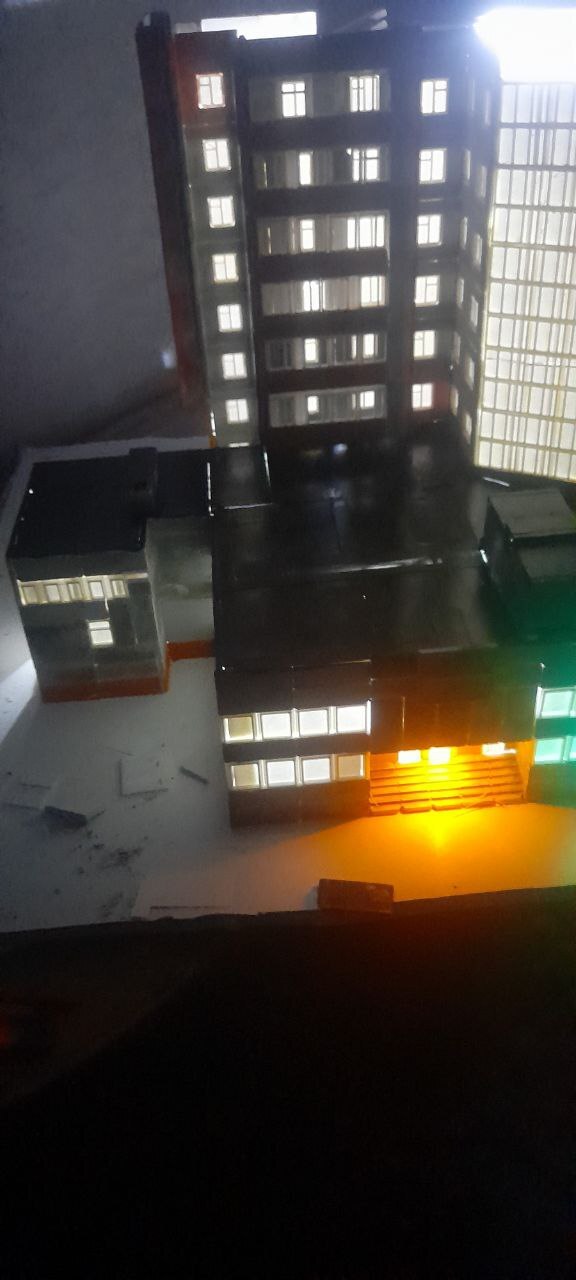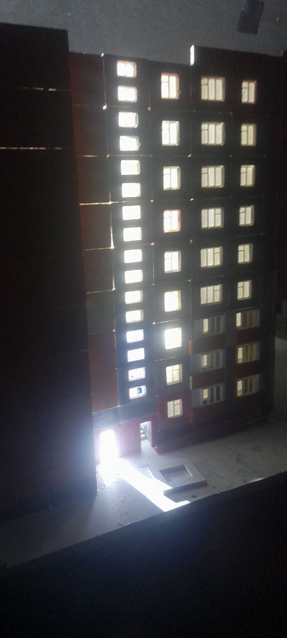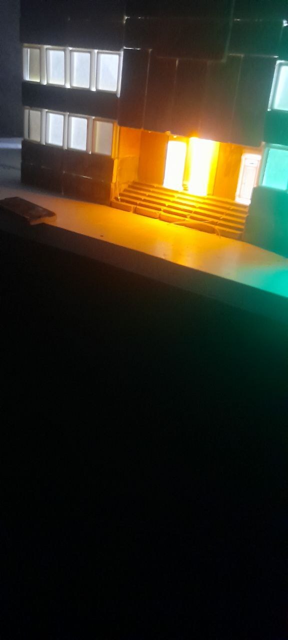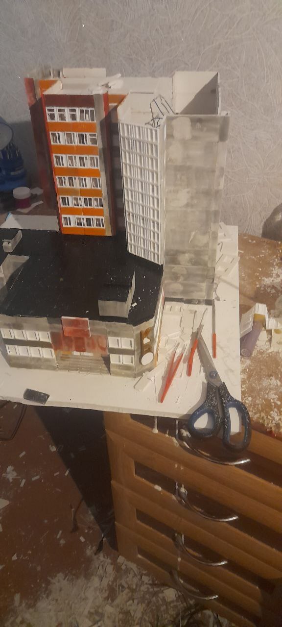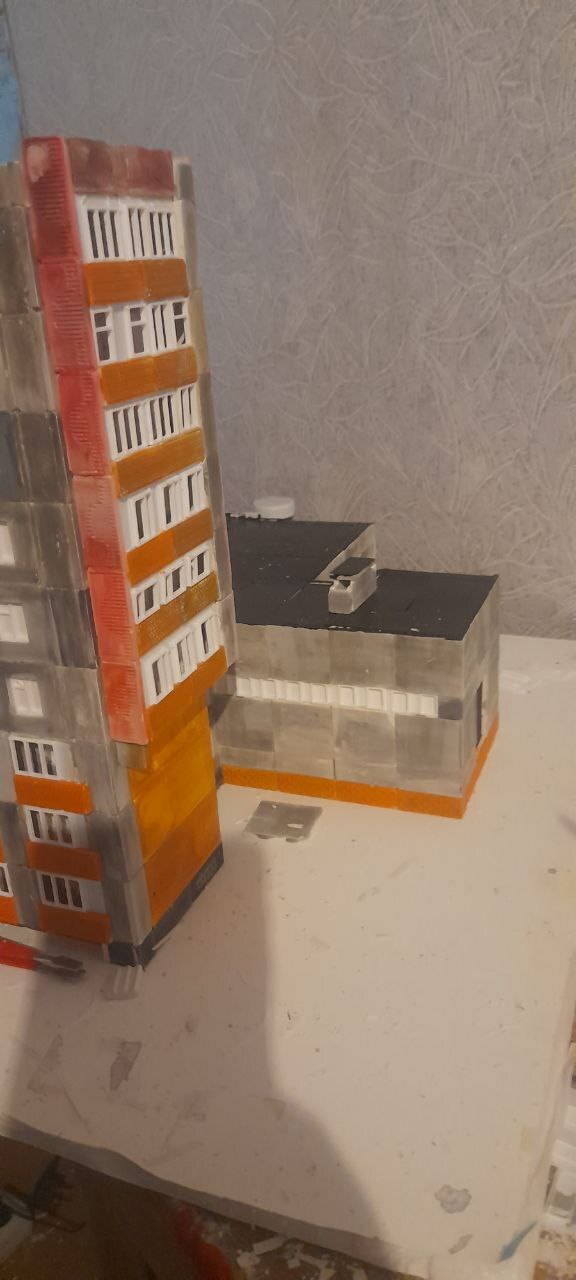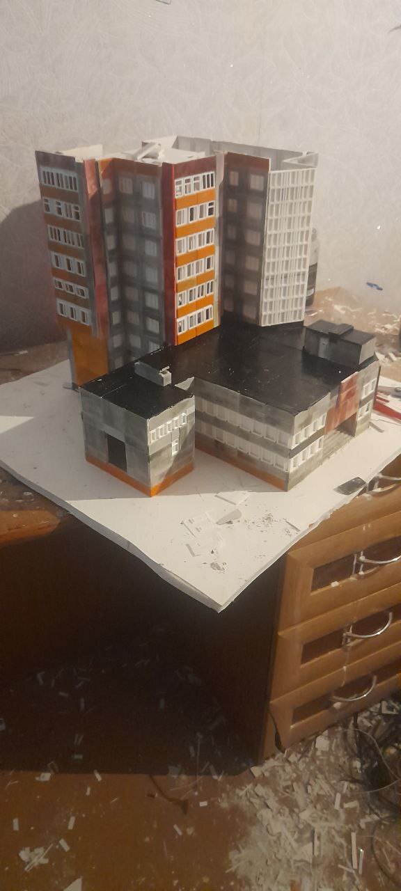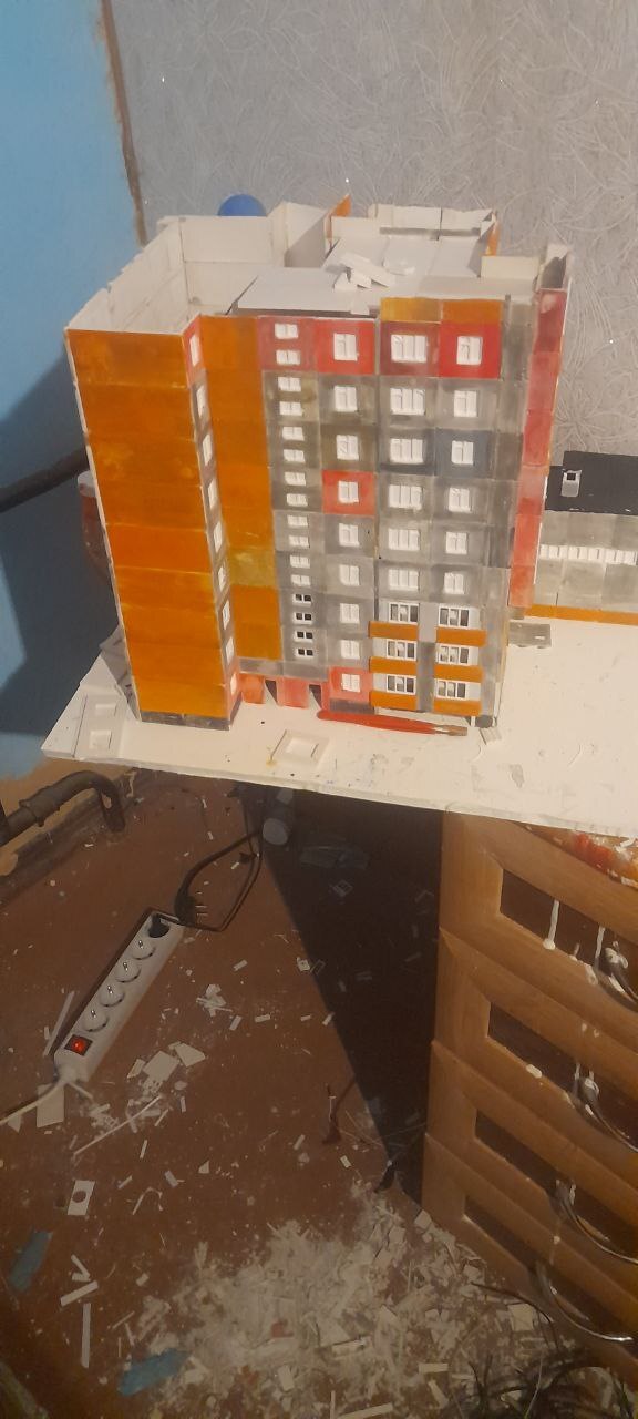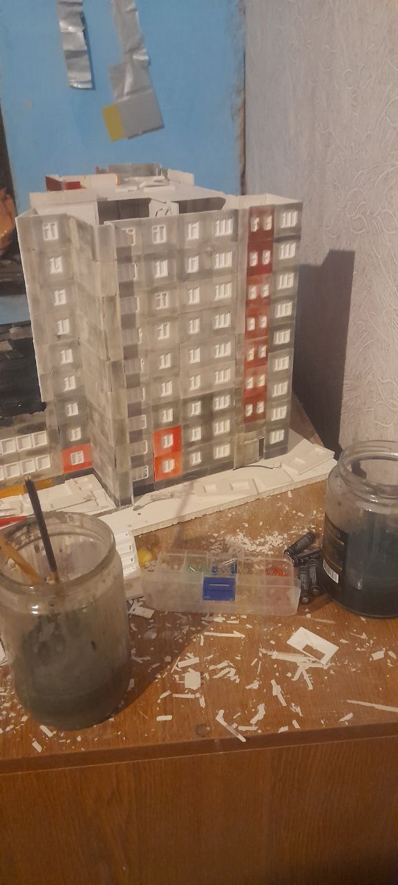 Собрал миниатюру советской панельки из дерева и раскрасил акварельными красками. В детстве я гулял во дворе такой панельки в 90-е, а теперь она стоит у меня на полке — в мини-версии.