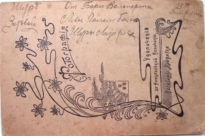 "Шуре Зотовой от Бори Вольперта, Левы Голембы и Шуры Лазарева. 23-го января нов.вр. 1919"⁠⁠