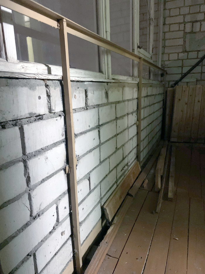 Лоджия - 6,8м х 1,2м ,передняя стенка выложена силикатным кирпичем в пол-кирпича, высотой 0,85м.
