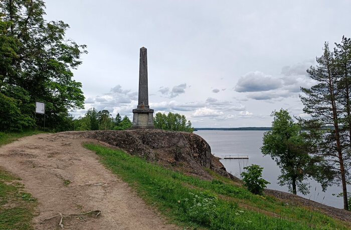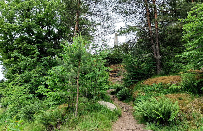 Монрепо интересен тем, что небольшие полянки и площадки на его территории тут же сменяются холмиками, тропинки из-за рельефа местности неровные и надо внимательно смотреть на карту, чтобы не пропустить нужный поворот. Вот между Главным усадебным домом и Долиной Розенталь можно наткнуться на холм, куда так и хочется подняться из-за возвышающегося обелиска. Идём?