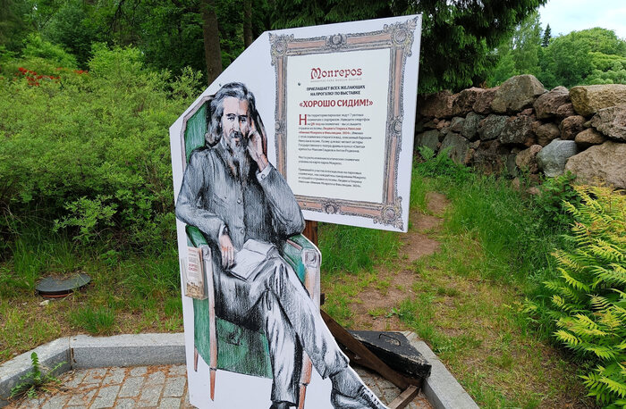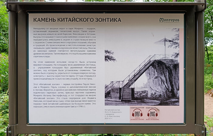 Музей-заповедник «Парк Монрепо» в конце 2010-х – начале 2020-х годов довольно неплохо провёл реконструкцию территории и добавил модные и популярные куар-коды в разные места парка. Это объявление предлагает послушать в избранных точках отрывки из поэмы Николаи «Имение Монрепо в Финляндии» (1804).