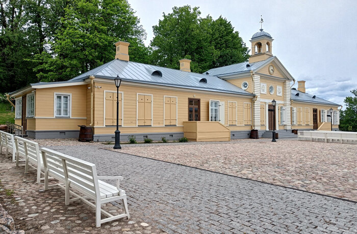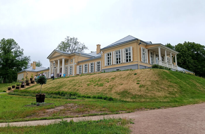 Вы заметили, что Главный усадебный дом стоит на возвышении. Оно образует удобную площадку, где с другой стороны пару дому составляет Библиотечный флигель 1804 года. Поначалу это был флигель для гостей и прислуги, но сын Николаи Павел Андреевич обустроил в нём библиотеку. Авторы текстов на табличках в парке упорно называют Павла Паулем; что за идолопоклонство перед Западом?.. Павел, в отличие от отца, родился в Петербурге, и пусть многие годы служил в Европе дипломатом, но уж его-то мы точно можем назвать в первую очередь русским подданным, а не немцем.